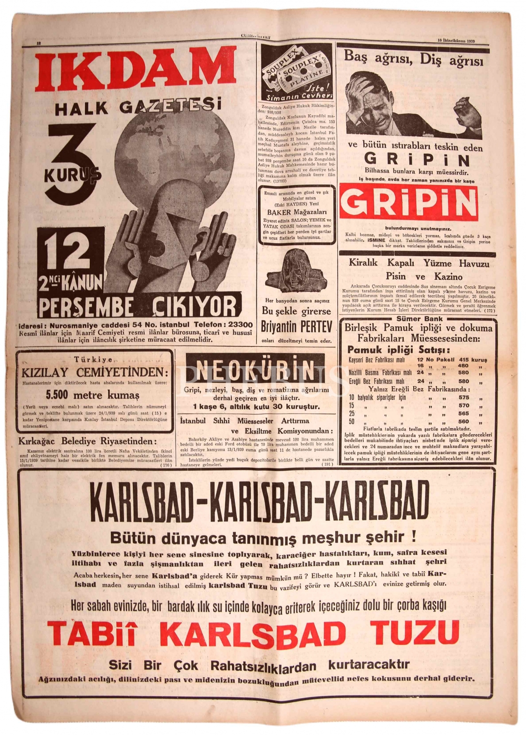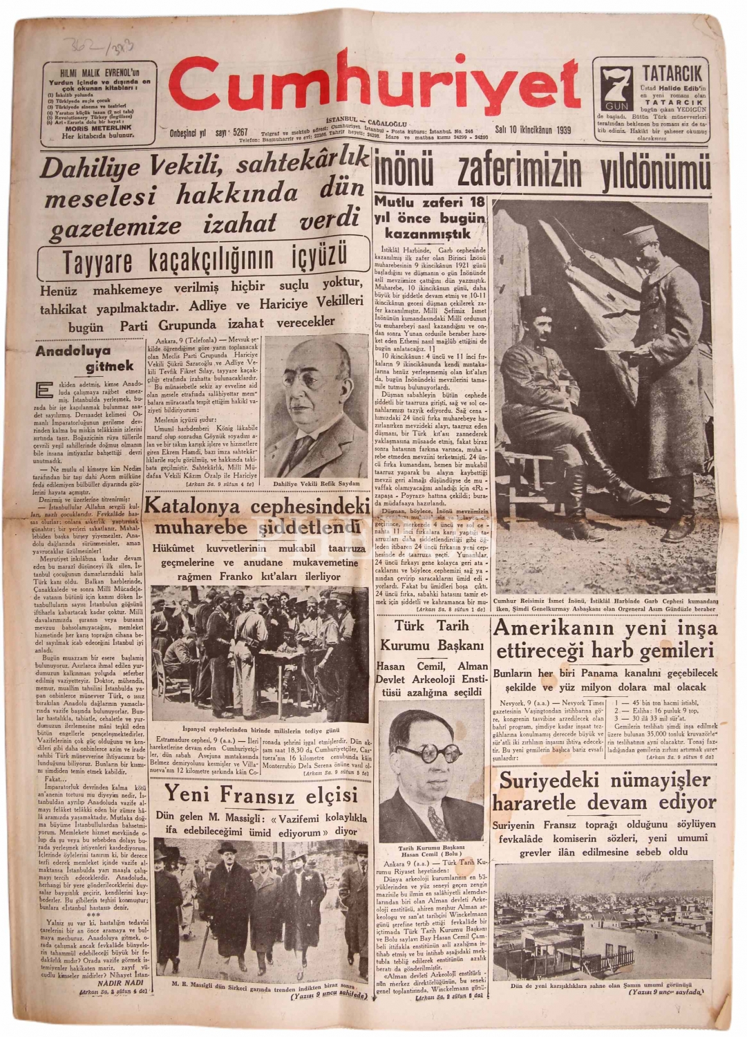 Cumhuriyet gazetesi, 10 İkincikanun 1939 tarihli,"İnönü Zaferimizn Yıldönümü", 44x62 cm