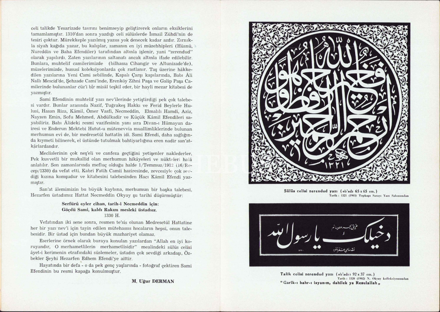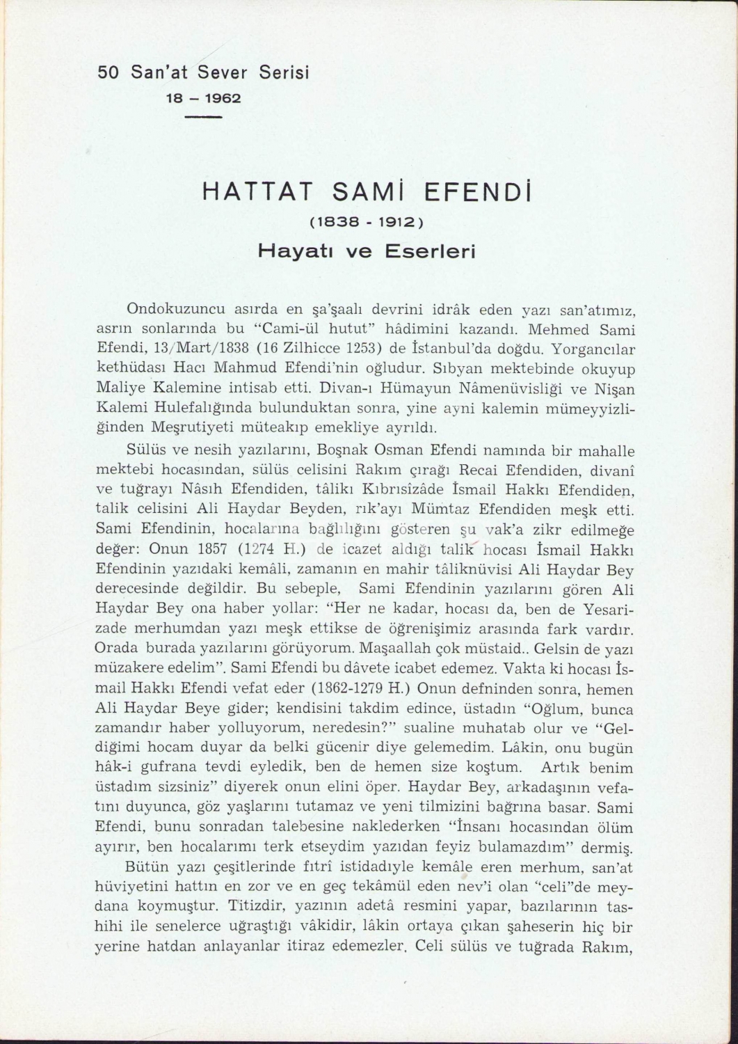 Vefatının 50. Yıldönümünde Sami Efendi Hayatı ve Eserleri, Eczacı M. Uğur Derman, Kemal Matbaası, 50 Sanat Sever Serisi-18, 1962, 3 sayfa, 17x25 cm
