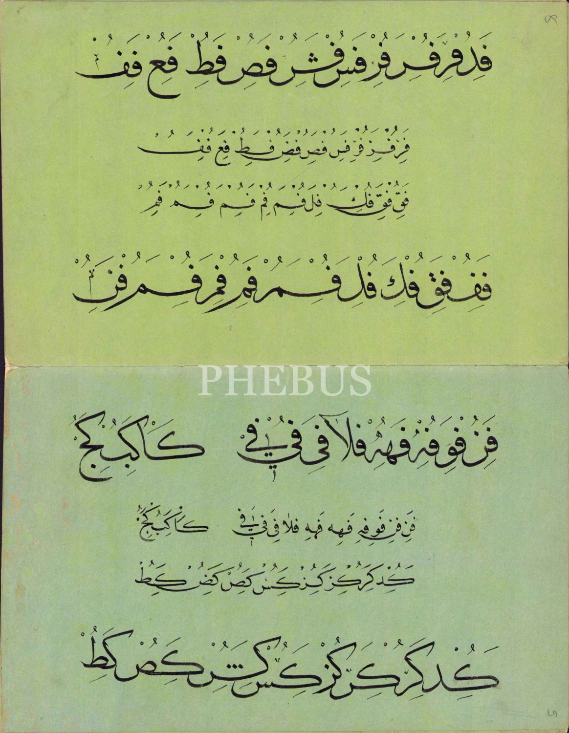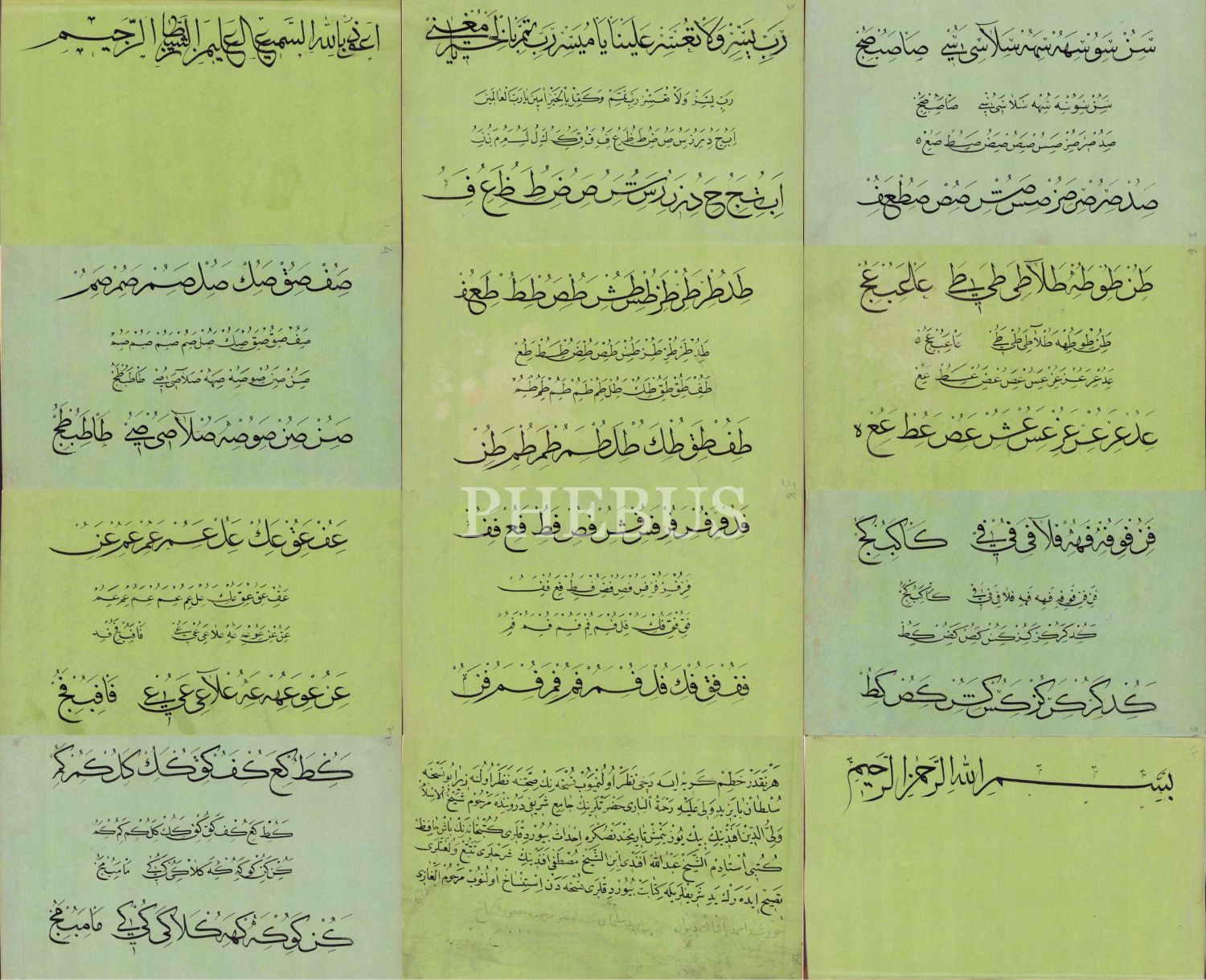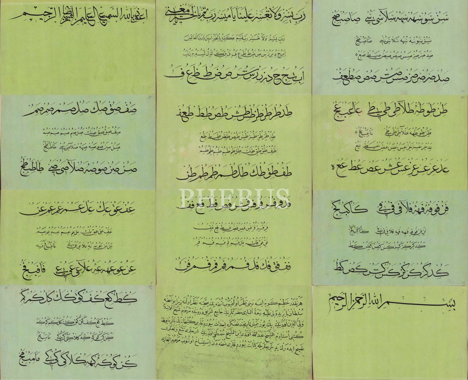 Sülüs Nesih Hurufat Meşk Murakkaı, Ebru Cild içinde 12 sayfa, son sayfada Bayezid Cami Kütüphanesi'ndeki bir nüshadan istinsah edidiğine dair kayıt mevcut, 15x24 cm
