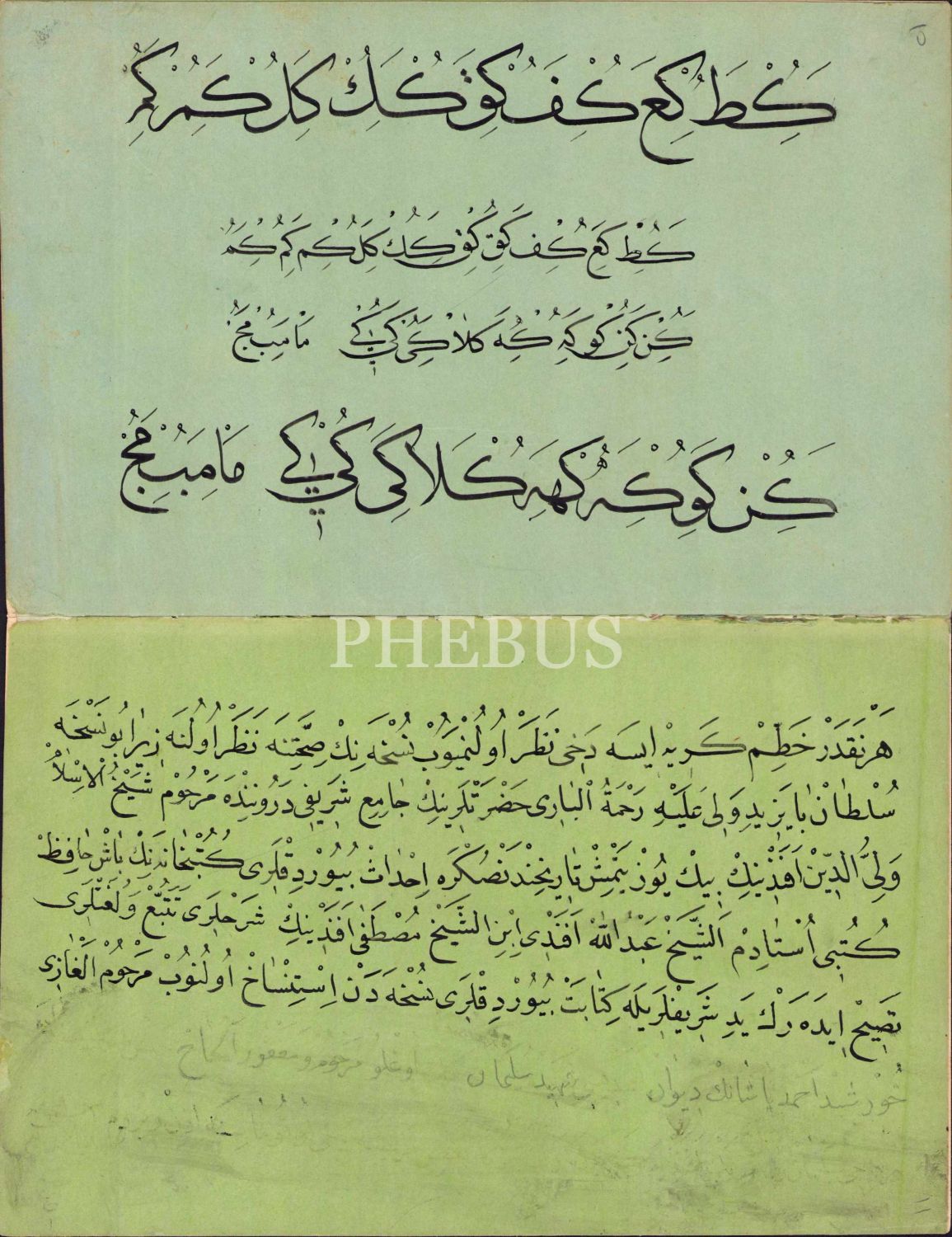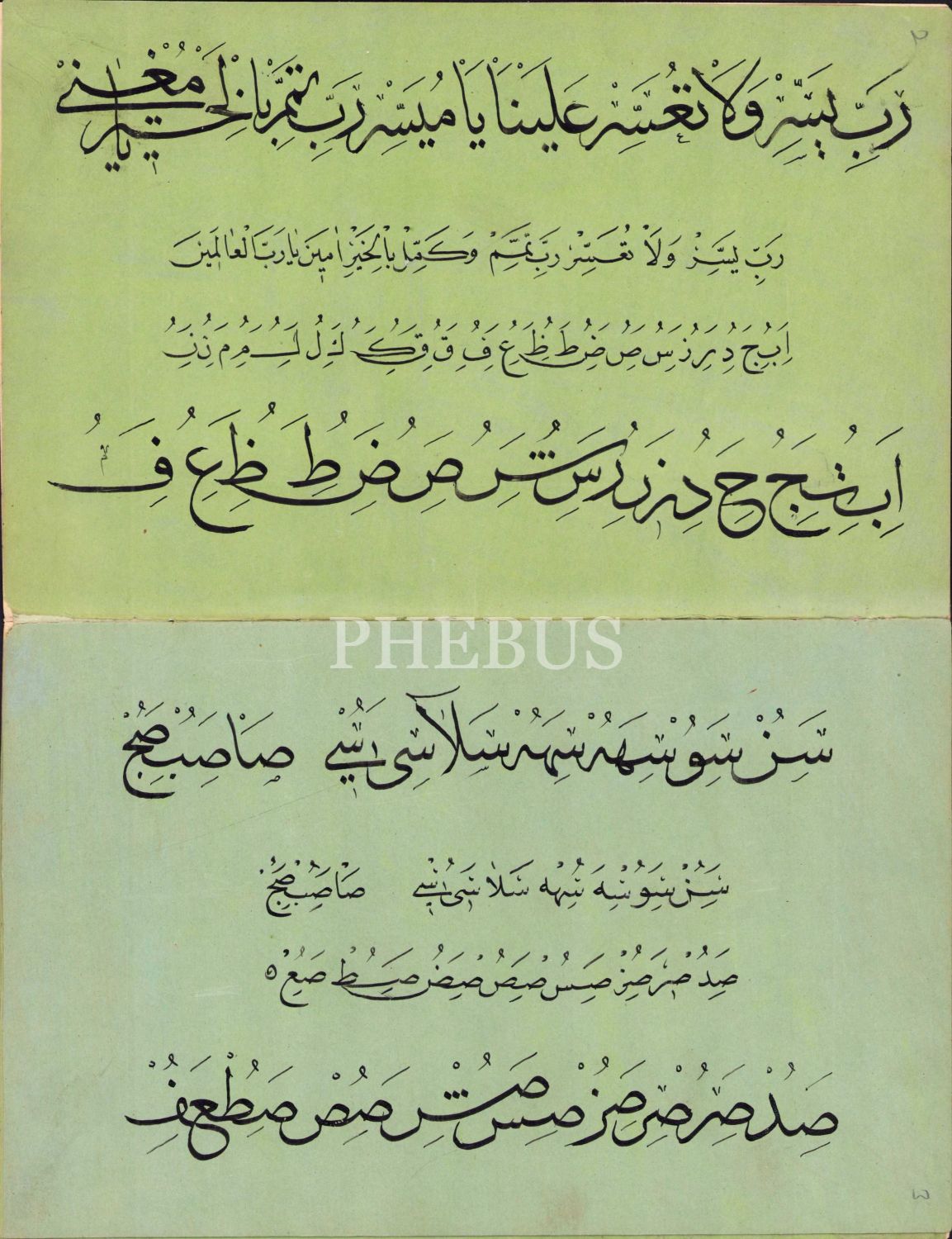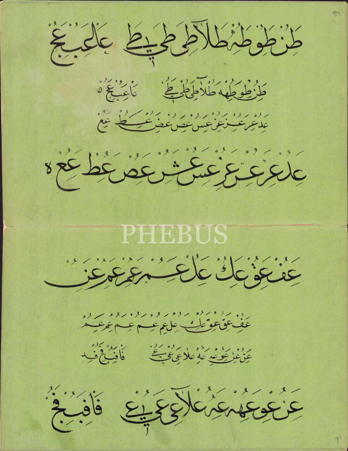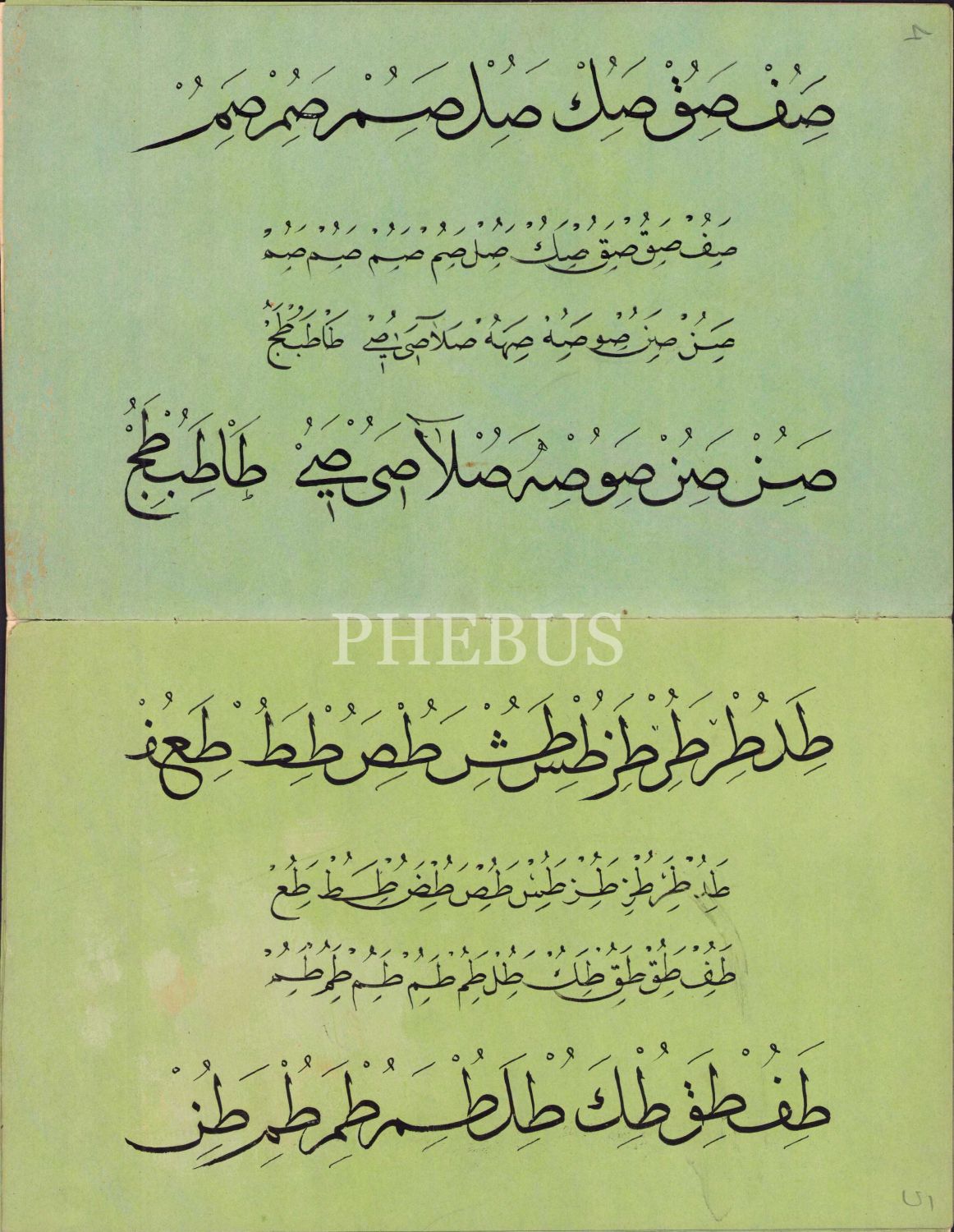 Sülüs Nesih Hurufat Meşk Murakkaı, Ebru Cild içinde 12 sayfa, son sayfada Bayezid Cami Kütüphanesi'ndeki bir nüshadan istinsah edidiğine dair kayıt mevcut, 15x24 cm