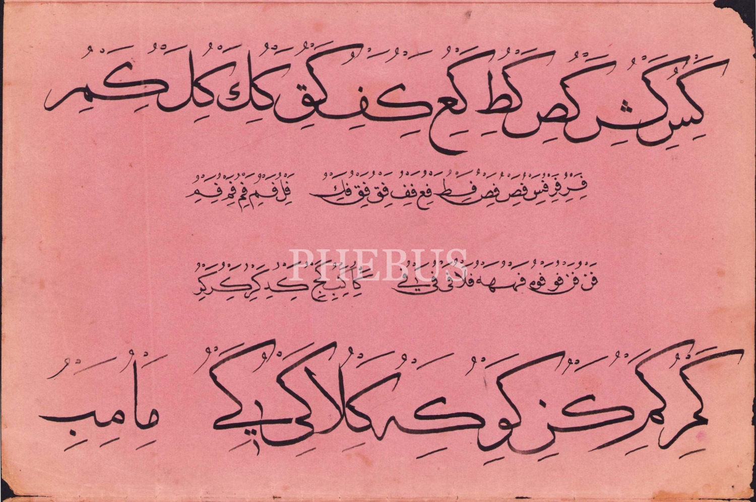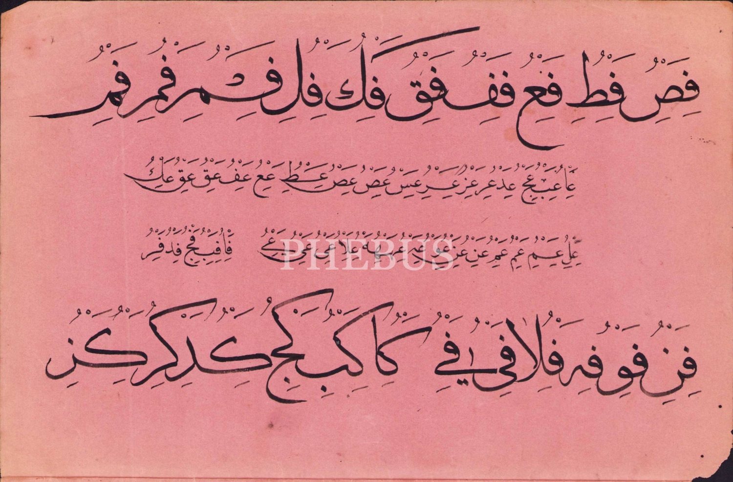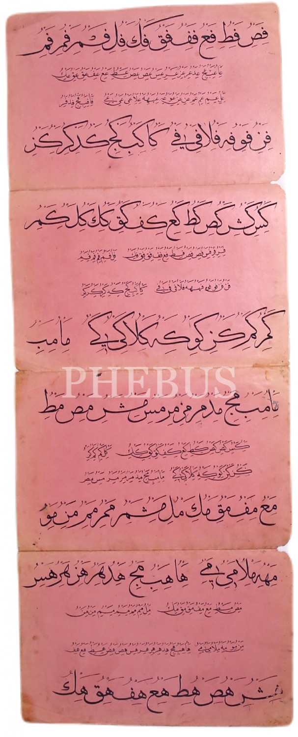 Sülüs Nesih Hurufat meşki, arka kısmında Osmanlıca "Kapamalı Mektebi Muallimi İbrahim Efendizade Hafız Mehmed Efendi'nin meşkidir" yazılıdır, birleşik halde 4 parça, 25x64 cm