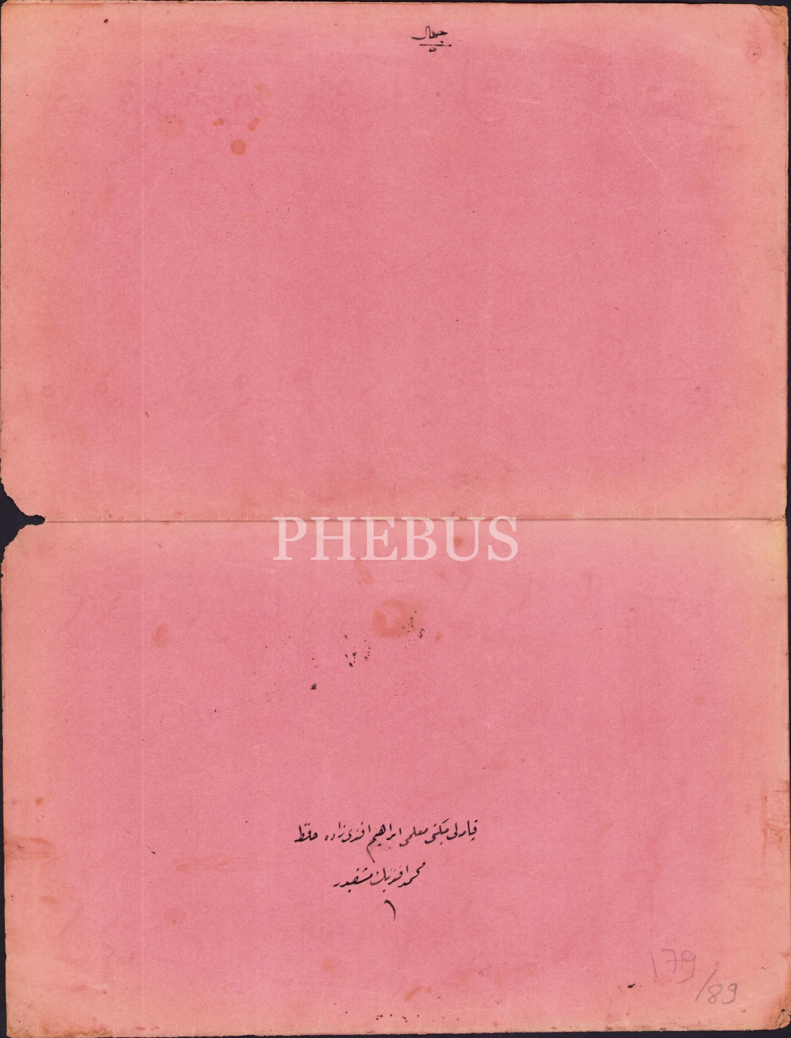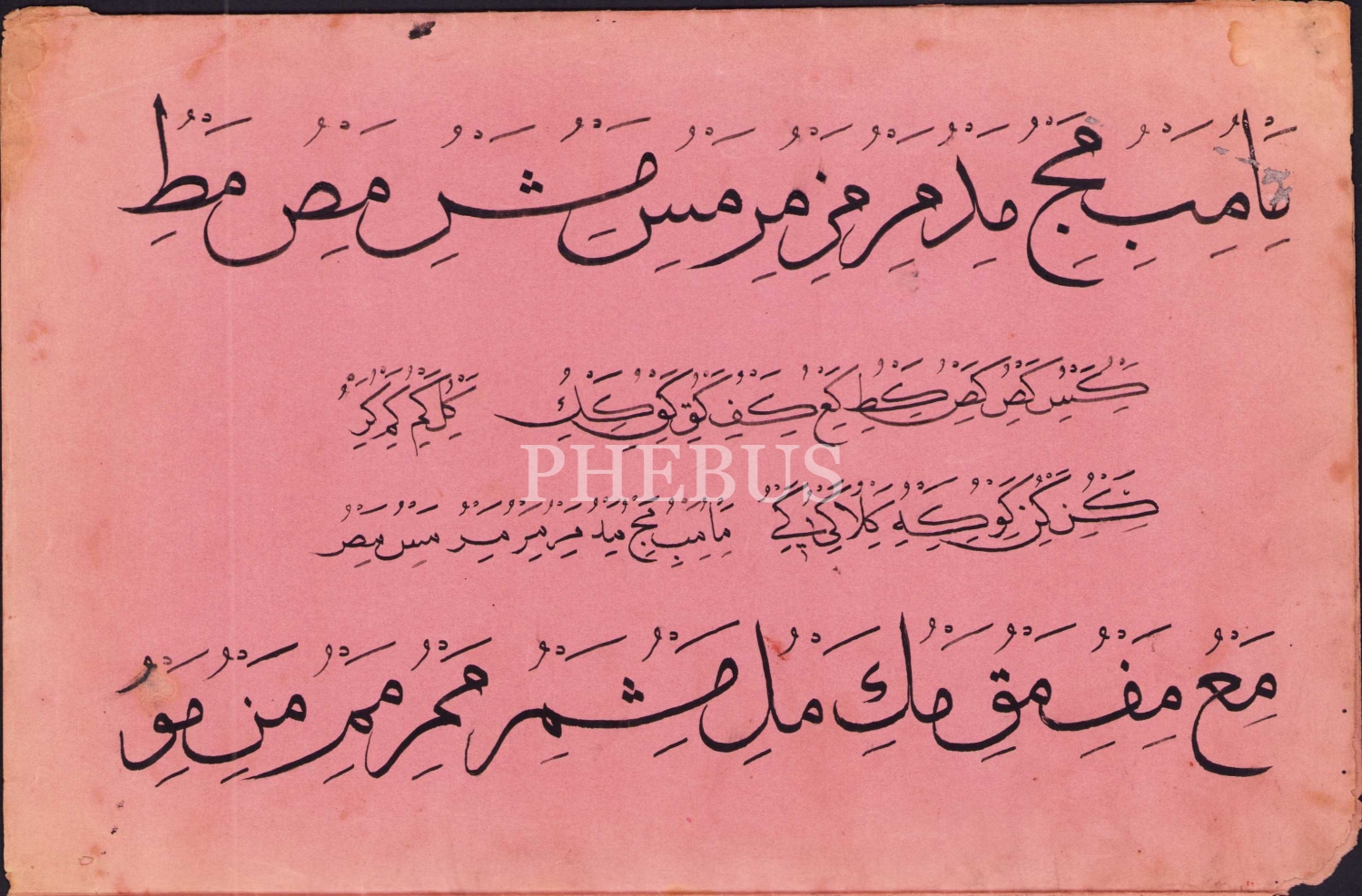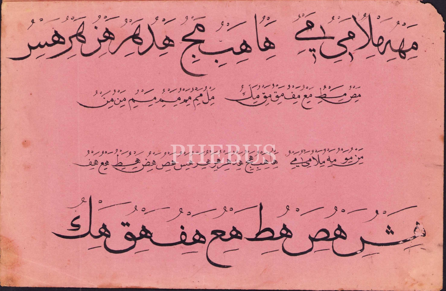 Sülüs Nesih Hurufat meşki, arka kısmında Osmanlıca "Kapamalı Mektebi Muallimi İbrahim Efendizade Hafız Mehmed Efendi'nin meşkidir" yazılıdır, birleşik halde 4 parça, 25x64 cm