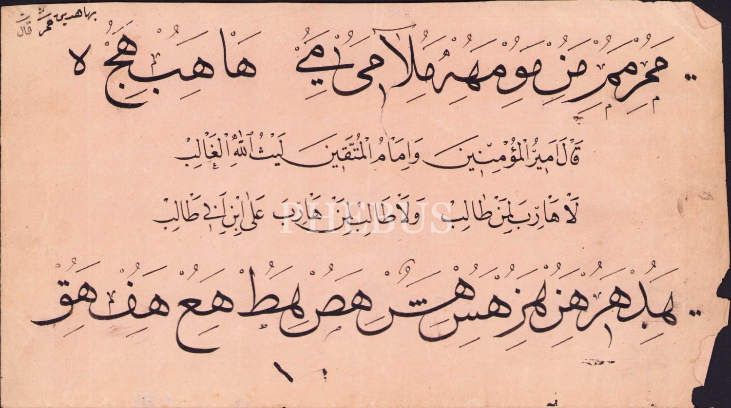 Sülüs Nesih Hurufat meşki ve Hadis-i Şerif, Nesih kısımda Hz. Ali'den rivayetle bir hadis-i şerif yazılıdır, üst kısmında Bahaeddin Efendi notu mevcuttur, 24x26 cm