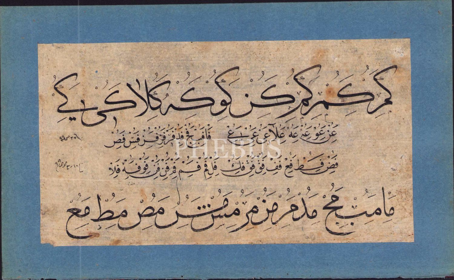 Sülüs Nesih Hoca işi Hurufat meşki, 10 Rebiülevvel 99 [1299] tarihli, 22x12 cm
