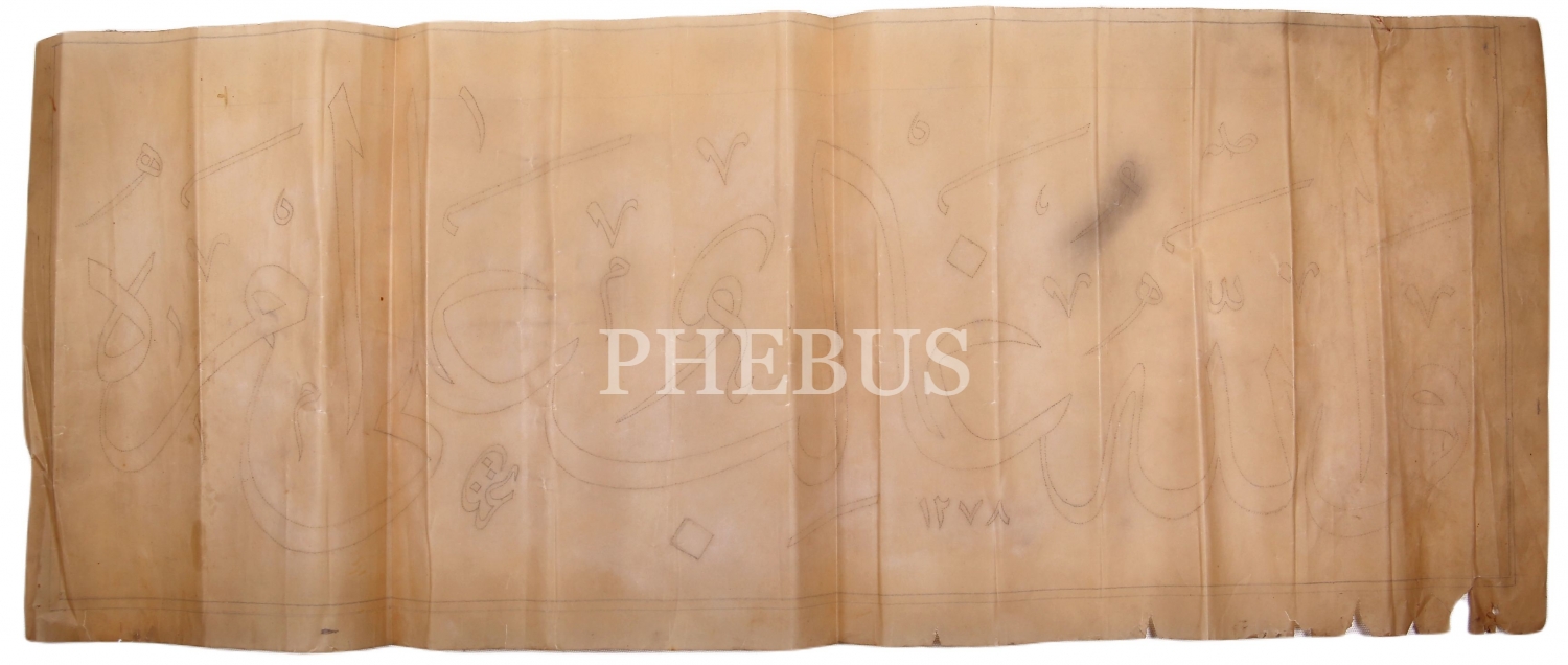 Kazasker Mustafa İzzet Efendi'nin Celi Sülüs "Vallahu galibün ala emri", "Allah işinde galiptir", eski dönem iğneli kalıp, 46x23 cm