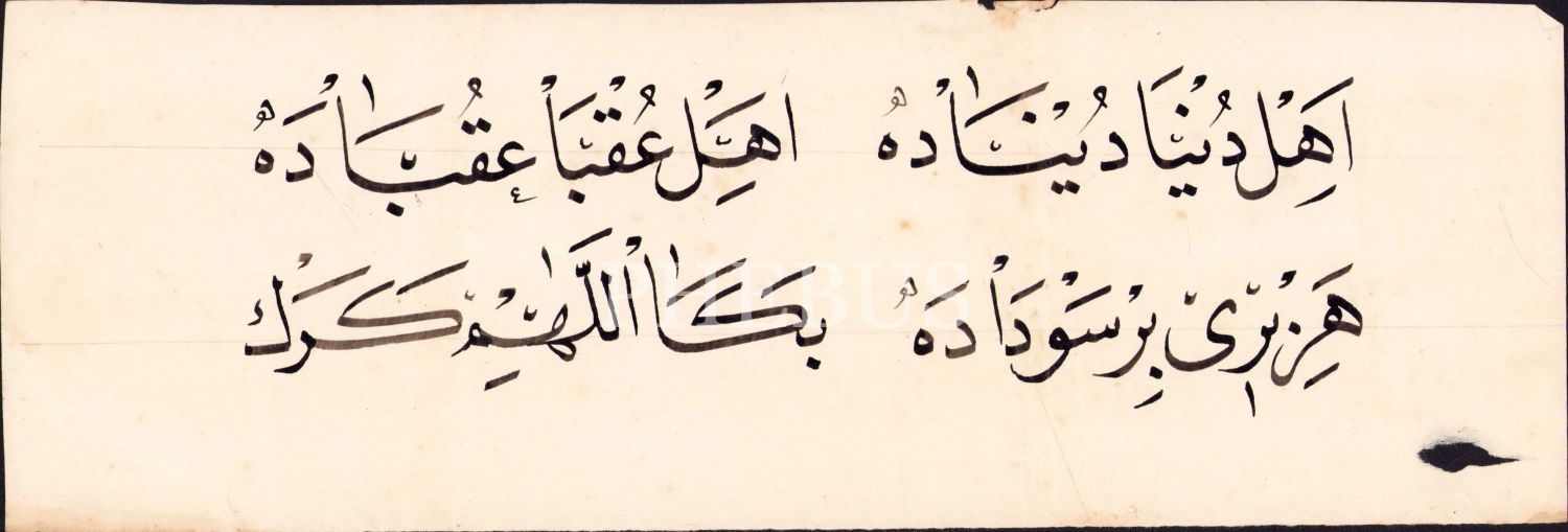 Nesih yazı, "Ehl-i dünya dünyada ehl-i ukba ukbada/ Her biri bir sevdada bana Allah'ım gerek", 30x10 cm
