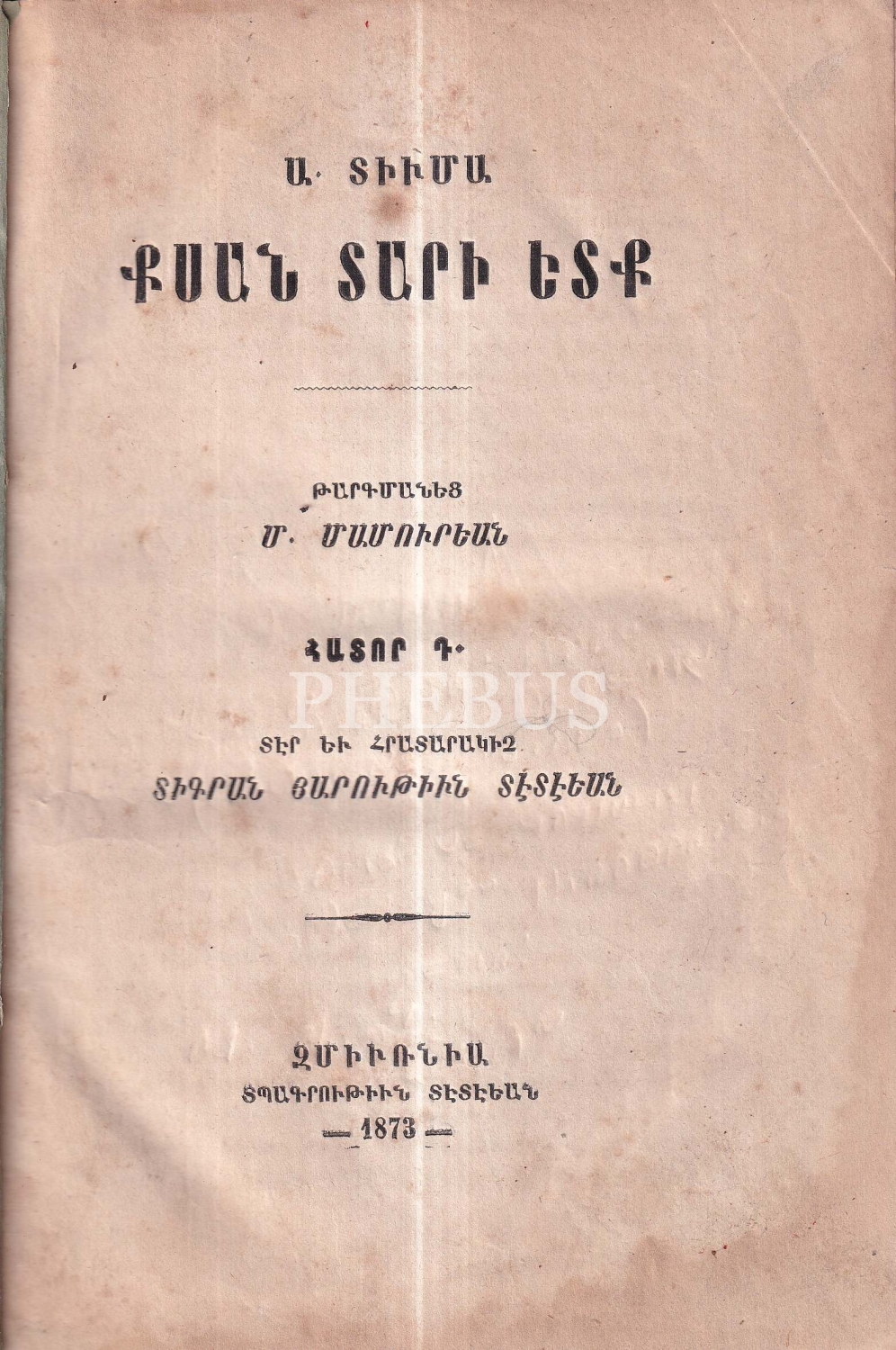 Ermenice 20 Sene Sonra, Alexandre Dumas, Çeviri M. Mamuryan, Kısım 4. Sahibi ve yayıncısı Hıradakis Dhuran Harutyun Dedeyan, 1873, 250 sayfa