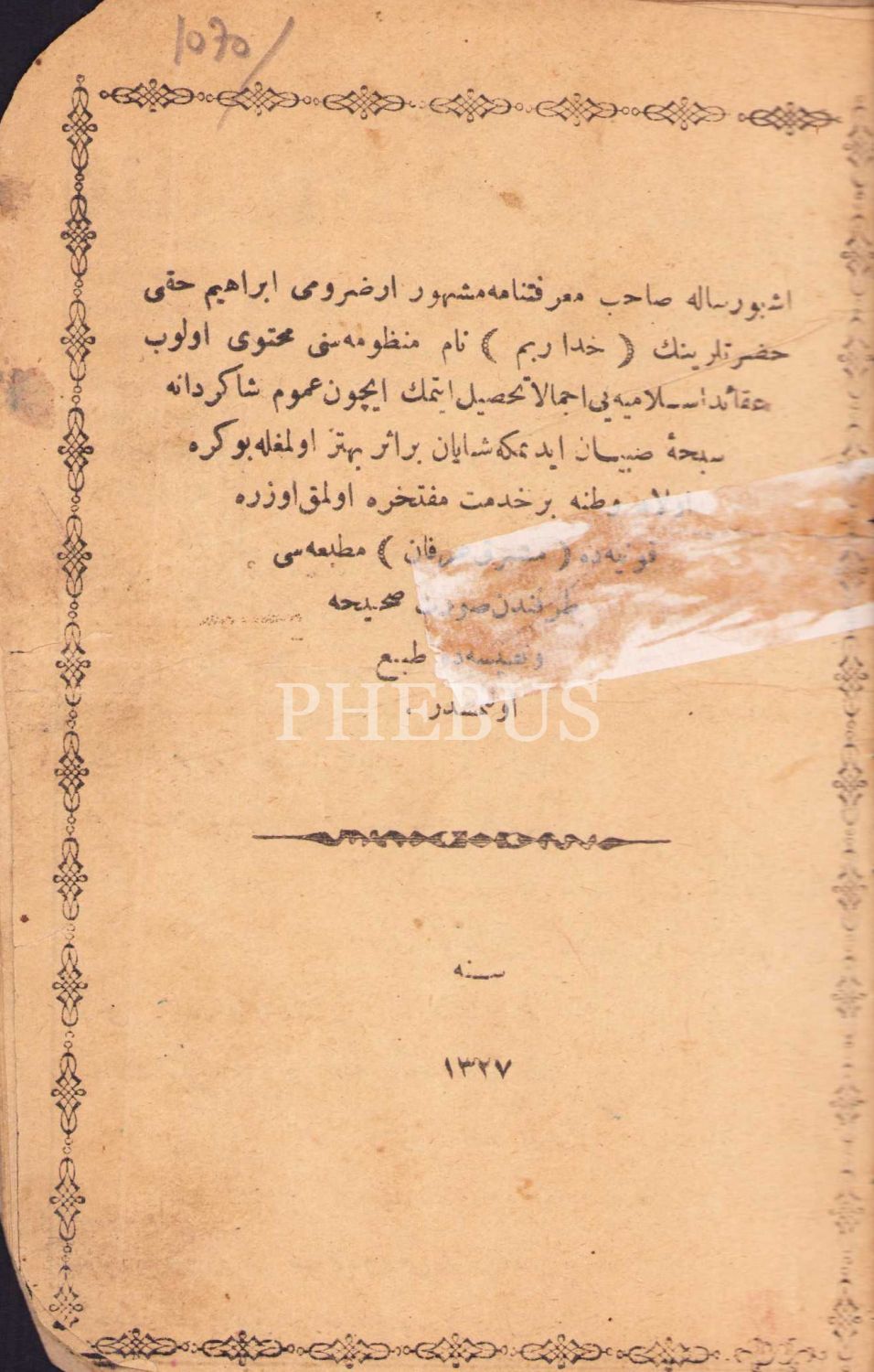 Osmanlıca Hüda Rabbim, Erzurumlu İbrahim Hakkı, İstanbul 1327 Rıza Efendi Matbaası, 14 sayfa, 18x13 cm, ÖZEGE; 7720