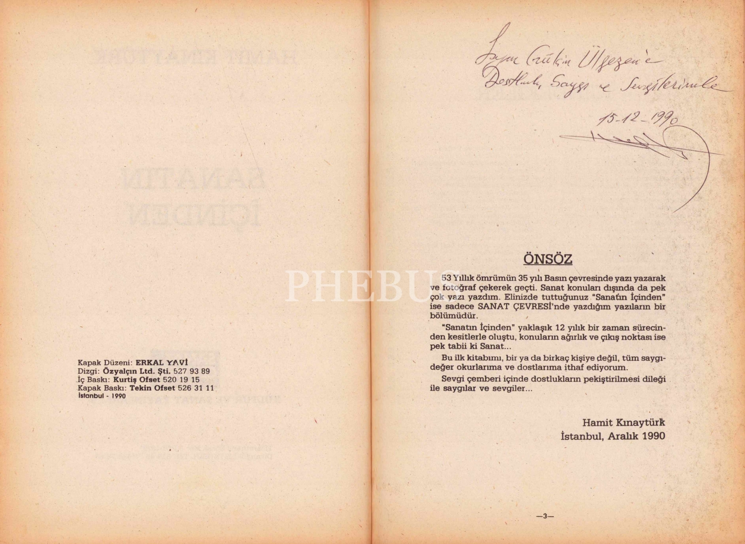 Sanatın İçinden, Hamit Kınaytürk'den ithaflı ve imzalı, İstanbul 1990, 173 sayfa, 16x22 cm