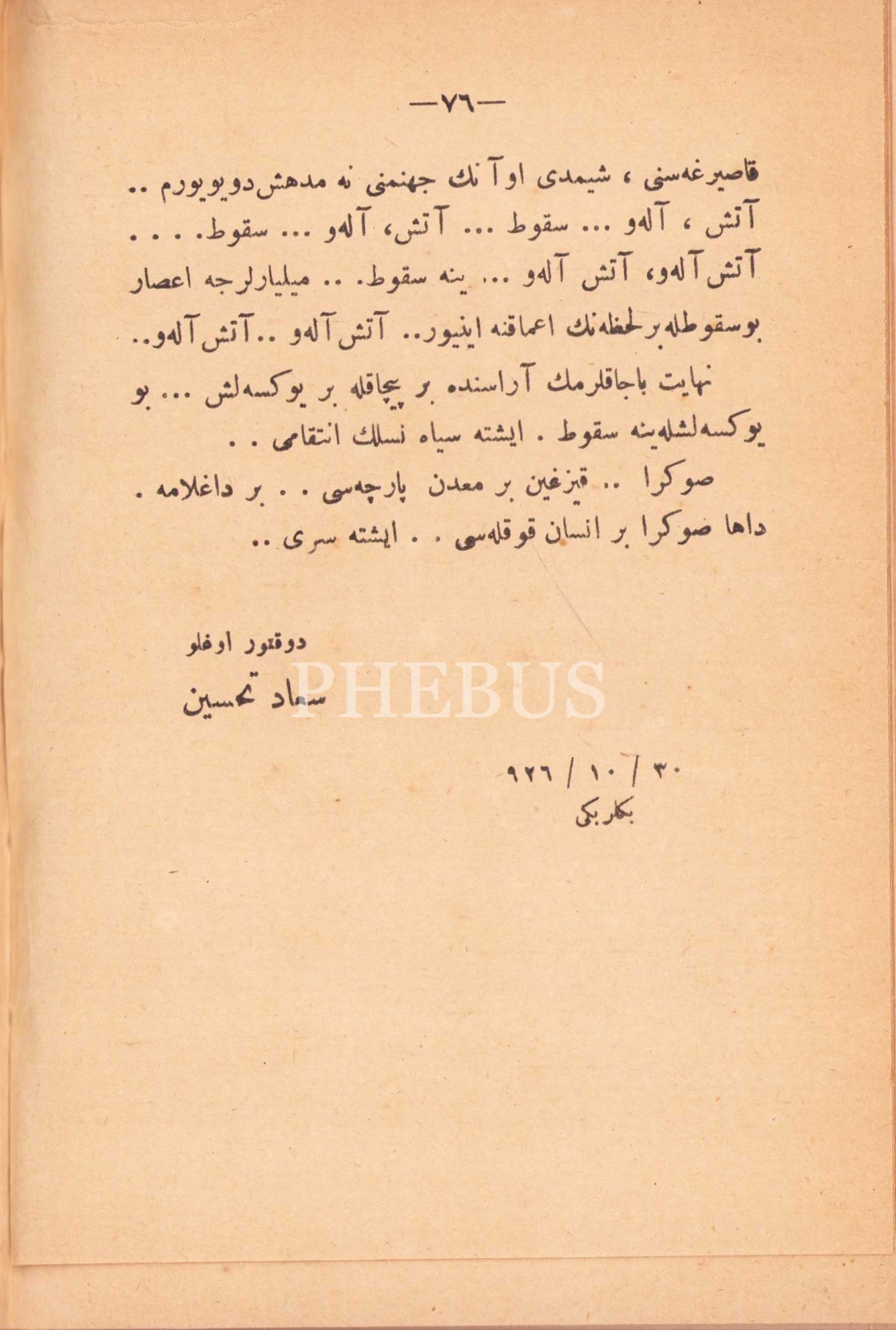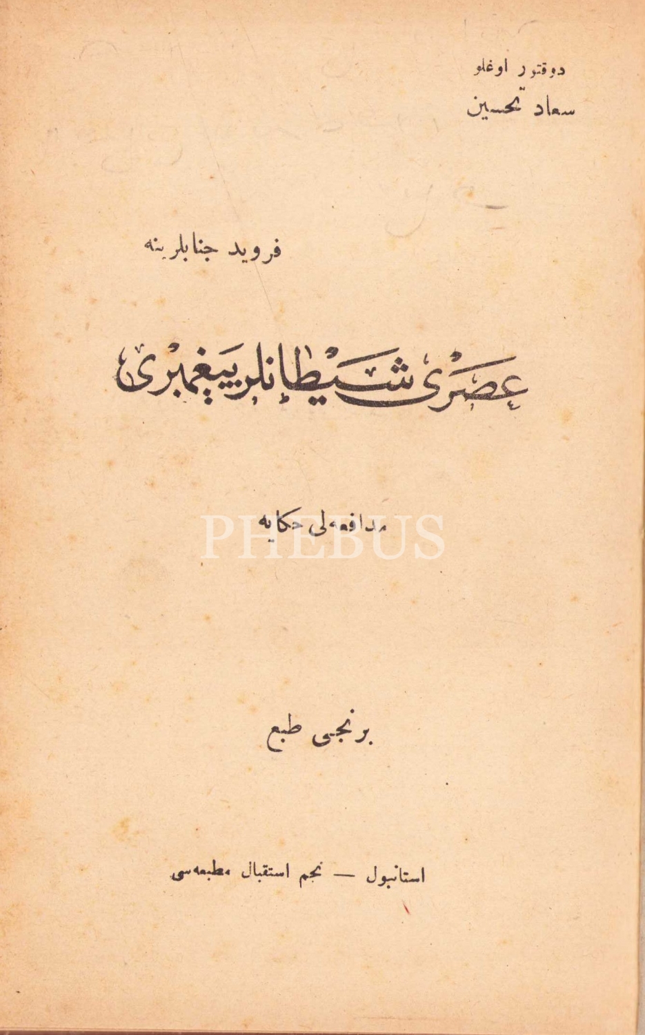 Osmanlıca "Asri Şeytanlar Peygamberi - Müdafaalı Hikaye", İlk Baskı, Doktoroğlu Suad Tahsin'den ithaflı ve imzalı, Necmi İstikbal Matbaası, İstanbul, 1926, yeni cildinde, 76 sayfa, 12x18 cm