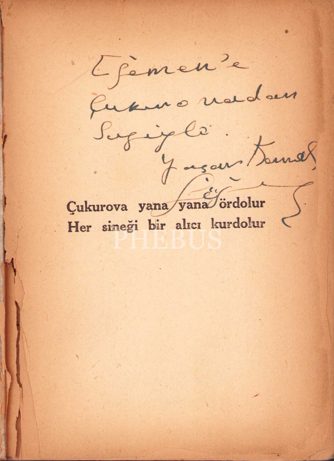 Çukurova Yana Yana, Yaşar Kemal'den imzalı ve ithaflı, İlk Baskı, İstanbul 1955, haliyle, 73 sayfa, 11x15 cm