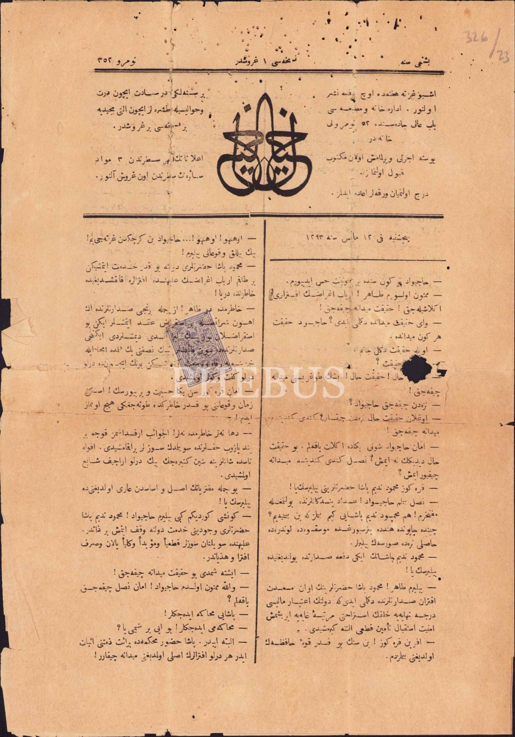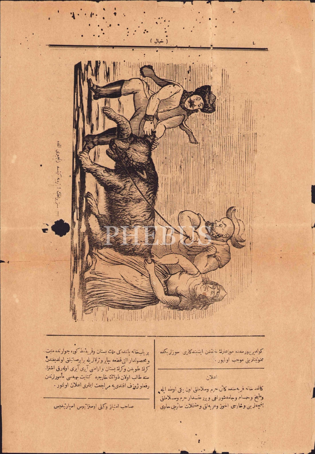 Osmanlı Basınında Sansüre Bir Örnek: Osmanlıca Hayal Mizah Gazetesi, 12 Mayıs 1293, yırtıklar mevcut, haliyle, 4 sayfa, 24x34 cm