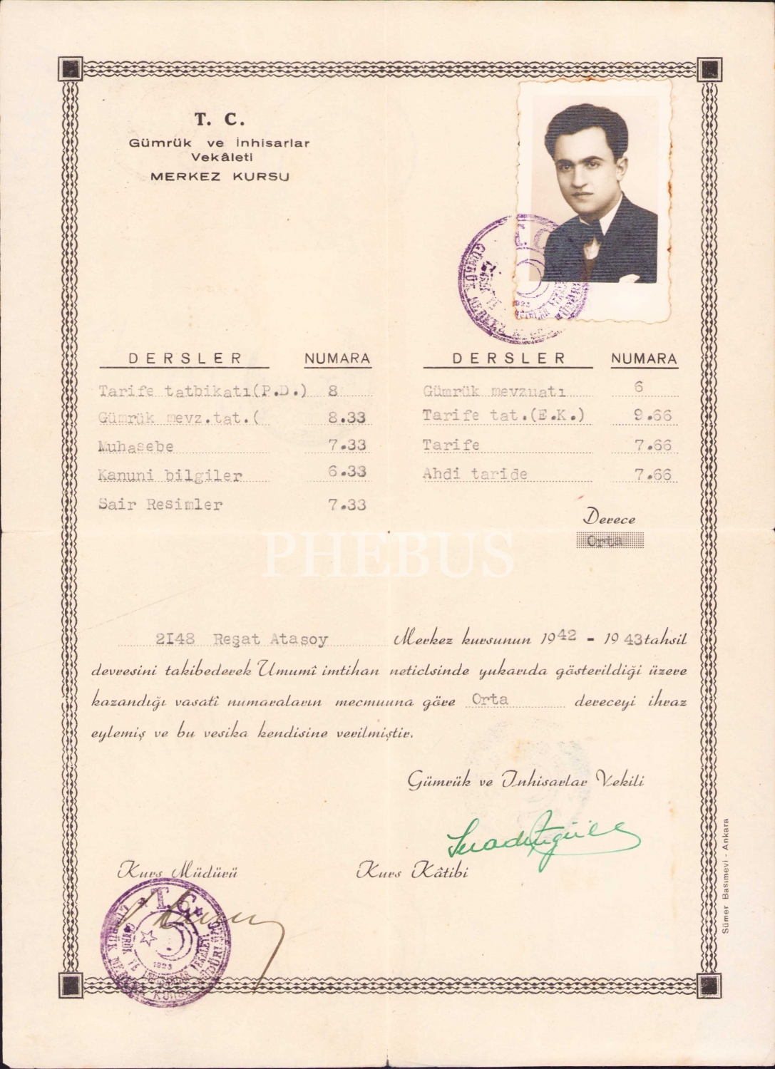 Gümrük İnhisarlar Vekaleti diploma, 1942 - 43, 1927 cm