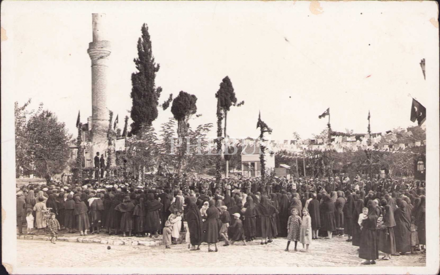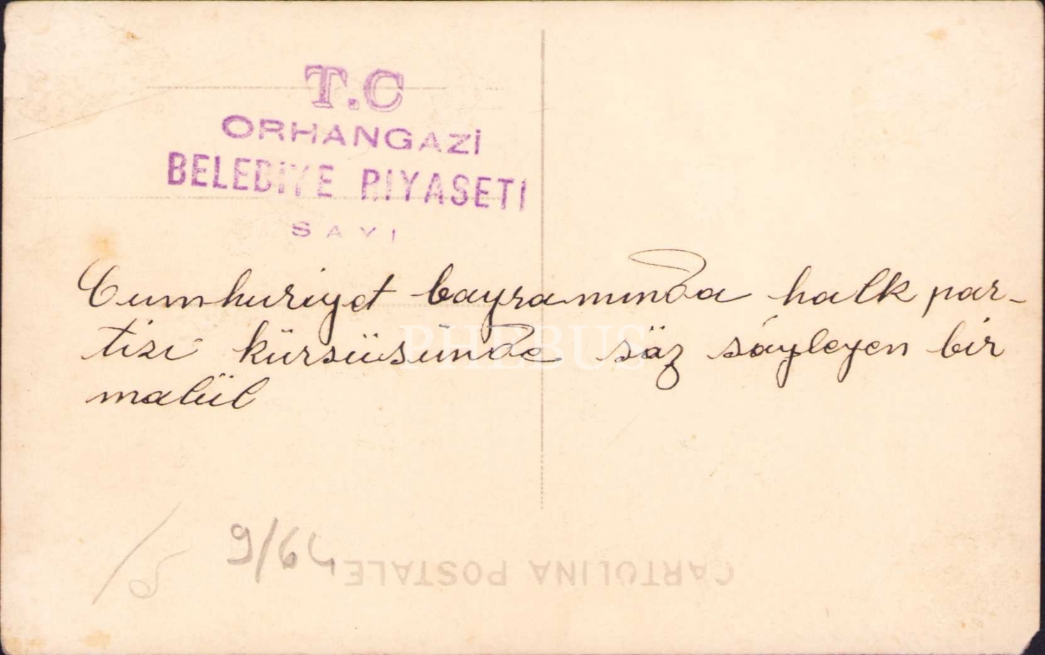 Bursa, Cumhuriyet bayramı Halk Partisi kürsüsünde konuşma yapan bir şahıs, TC Orhan Gazi Belediye Riyaseti damgalı