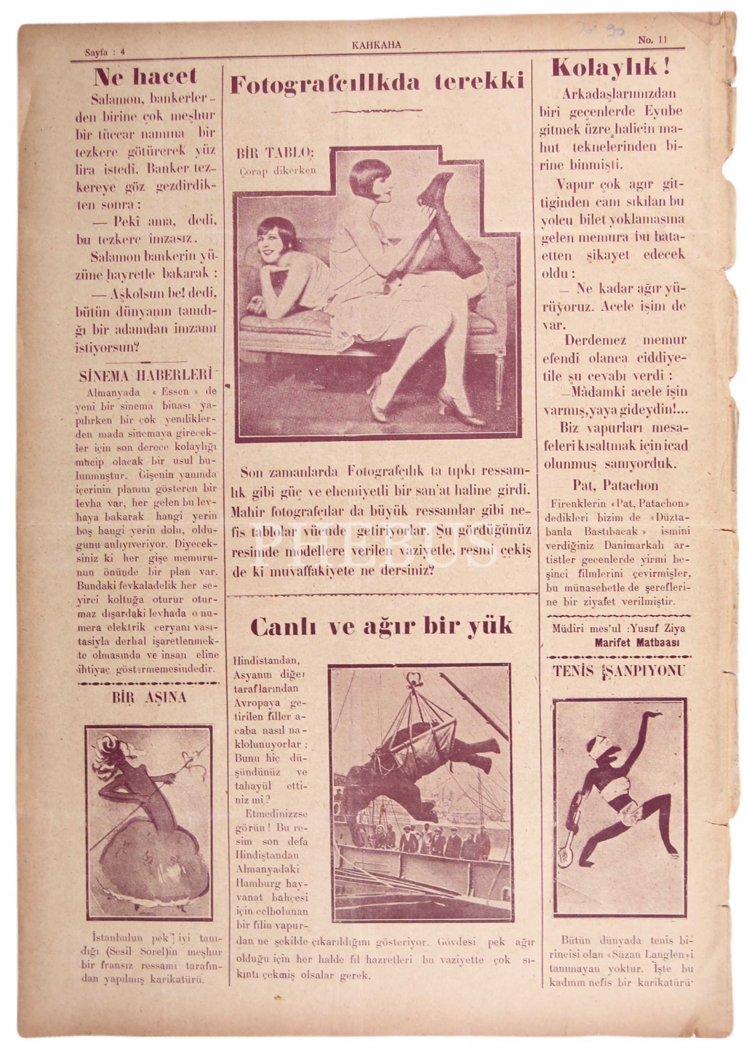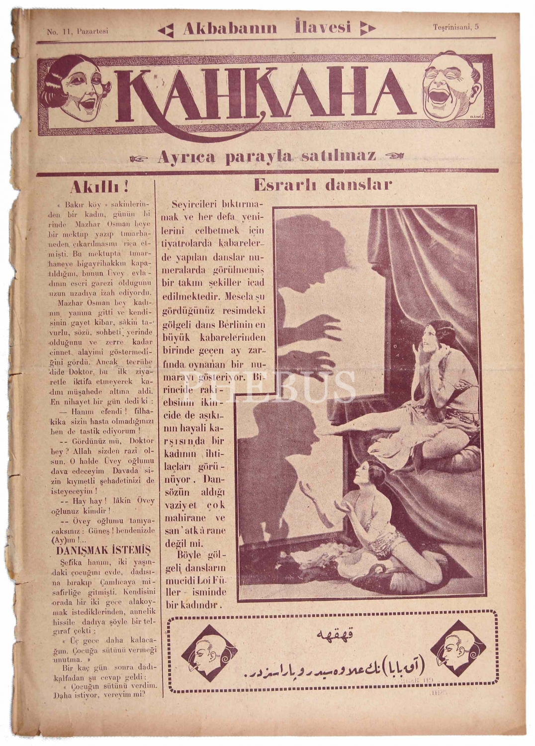 Akbaba'nın İlavesi Kahkaha, No. 11, 5 Teşrini Sani, Osmanlıca olarak da Akbaba'nın ilavesidir yazmaktadır, sayfalar kopuk, 4 sayfa, 27x37 cm