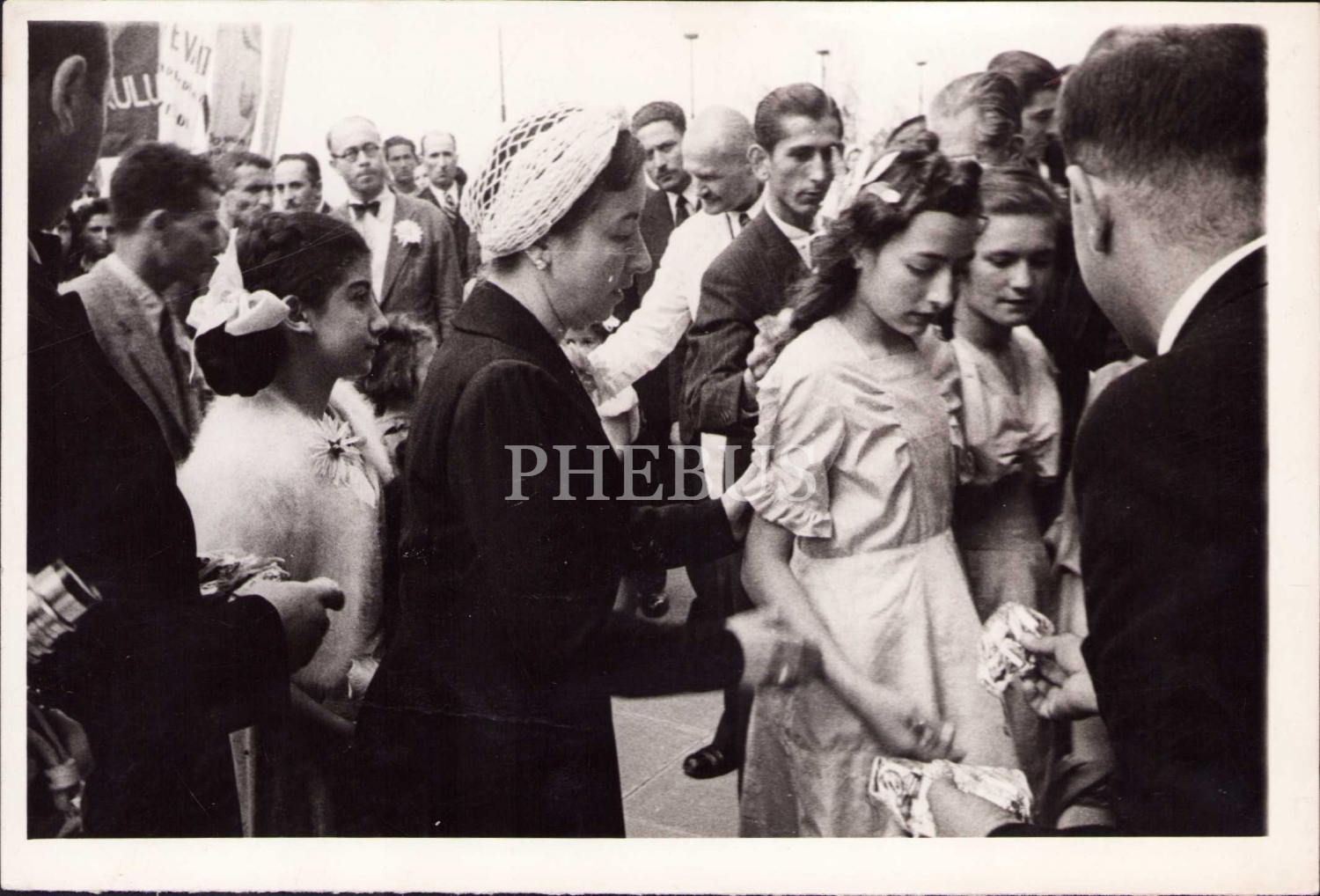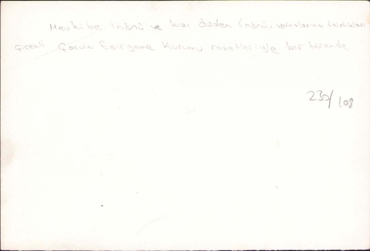 Mevhibe İnönü ve kızı Özden İnönü, yakalarına taktıkları çiçekli Çocuk Esirgeme Kurumu rozetleriyle bir törende, 17x11 cm