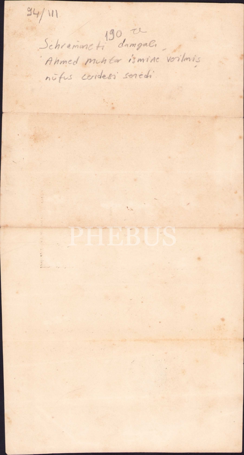 Şehremaneti damgalı, Ahöed Muhtar ismine verilmiş Osmannlıca nüfus ceridesi senedi, 14x27 cm