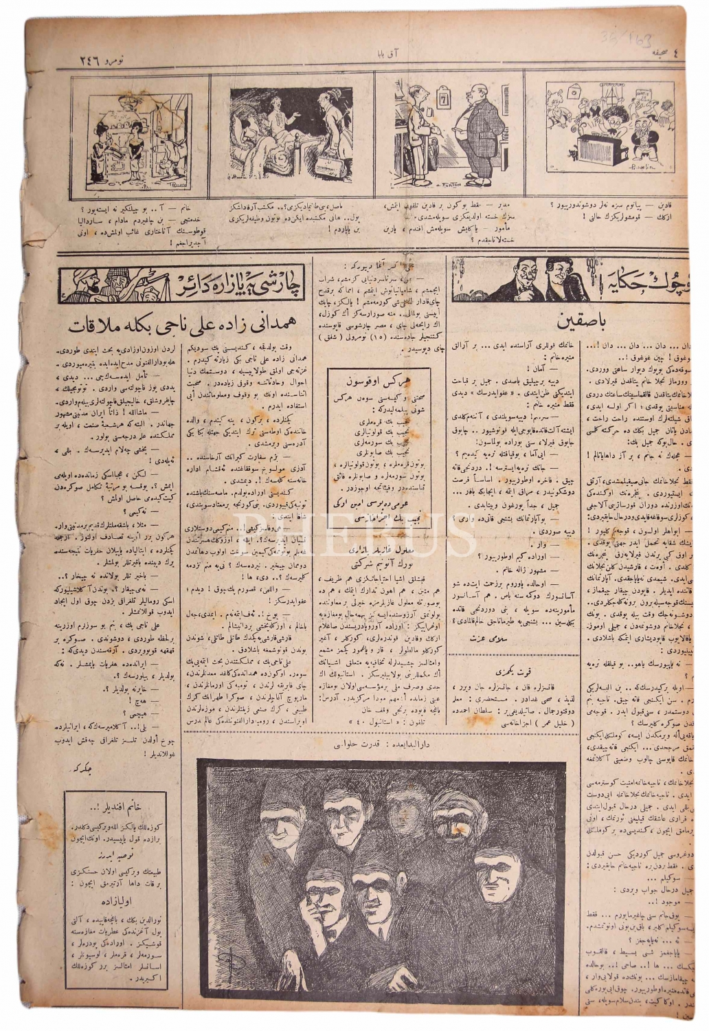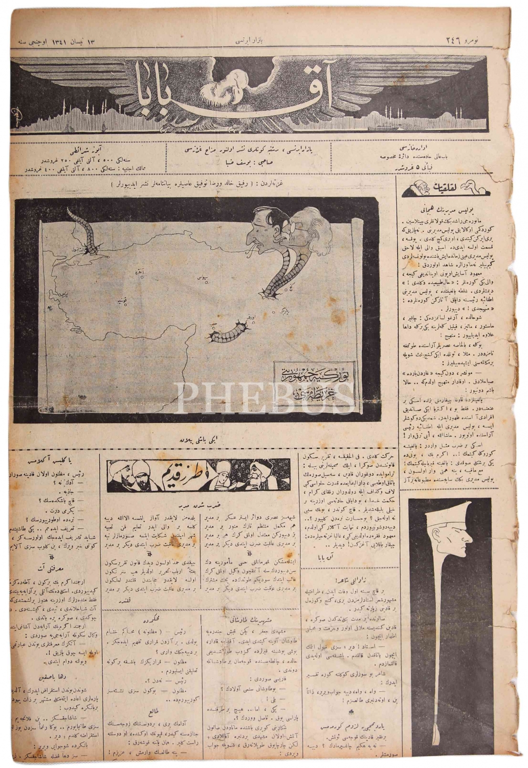 Osmanlıca Akbaba mizah gazetesi, 13 Nisan 1341, sahibi Yusuf Ziya, kapak, T.C. haritası formunda: "Gazetelerden [Refik Halid ve Rıza Tevfik Asilere Beyanname Neşrederken]", cilt çıkması, 4 sayfa, 29x39 cm