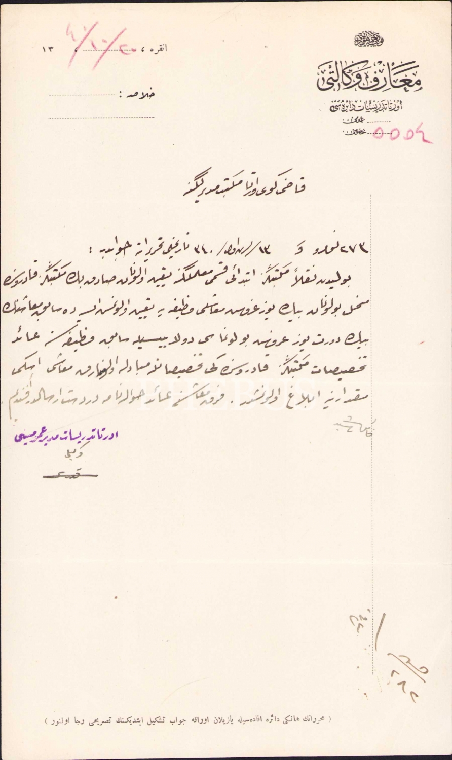 Osmanlıca Türkiye Cumhuriyeti Maarif Vekaleti antetli Kadıköy Orta Mektebi Müdürlüğüne gönderilmiş 1340 tarihli doküman, 14x24 cm