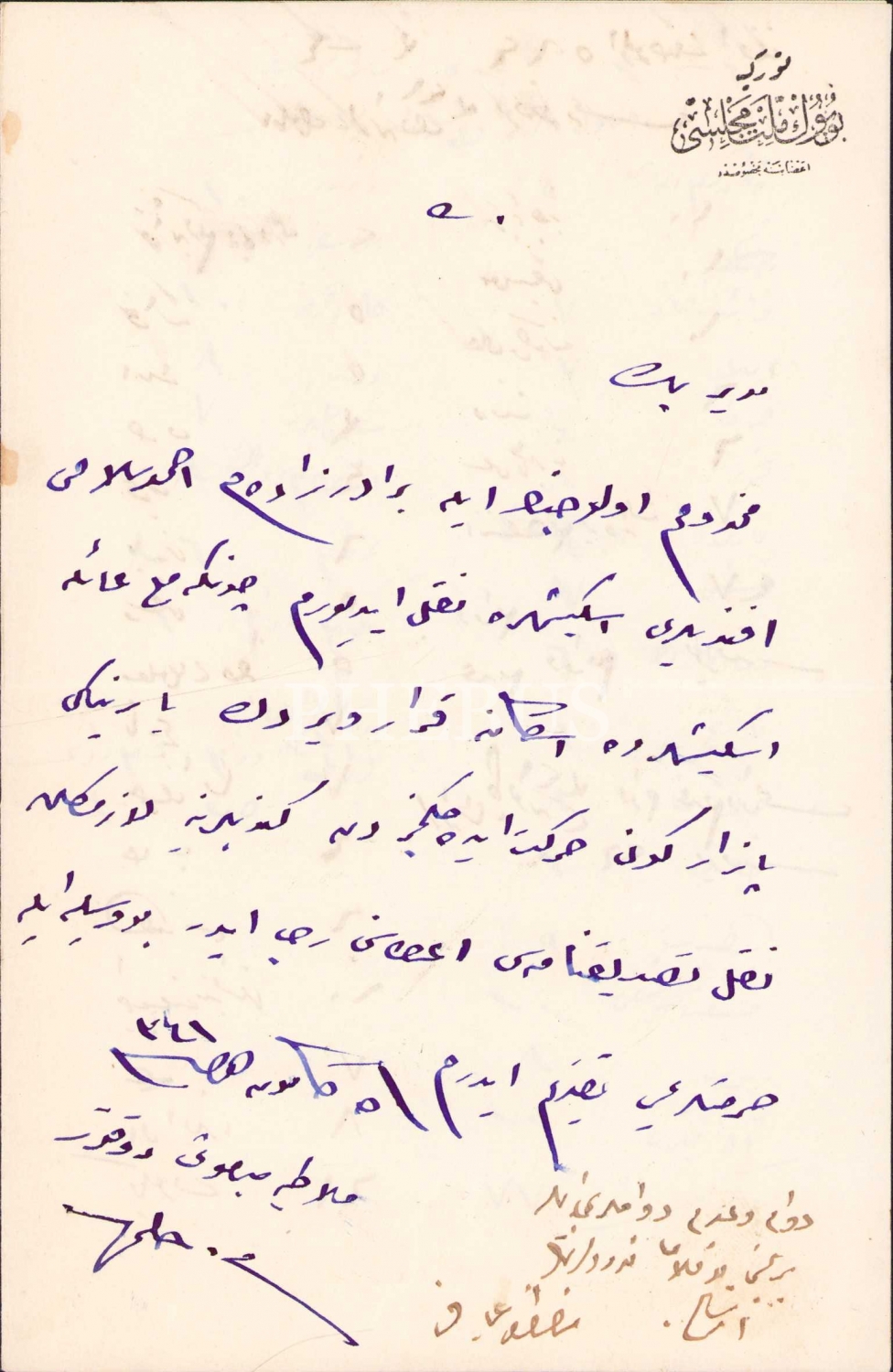 Osmanlıca Türkiye Büyük Millet Meclisi Azasına mahsus antetli Ahmed Selami Efendinin Eskişehir'e nakl edilmesi hakkında 1341 tarihli döküman, 12x18 cm