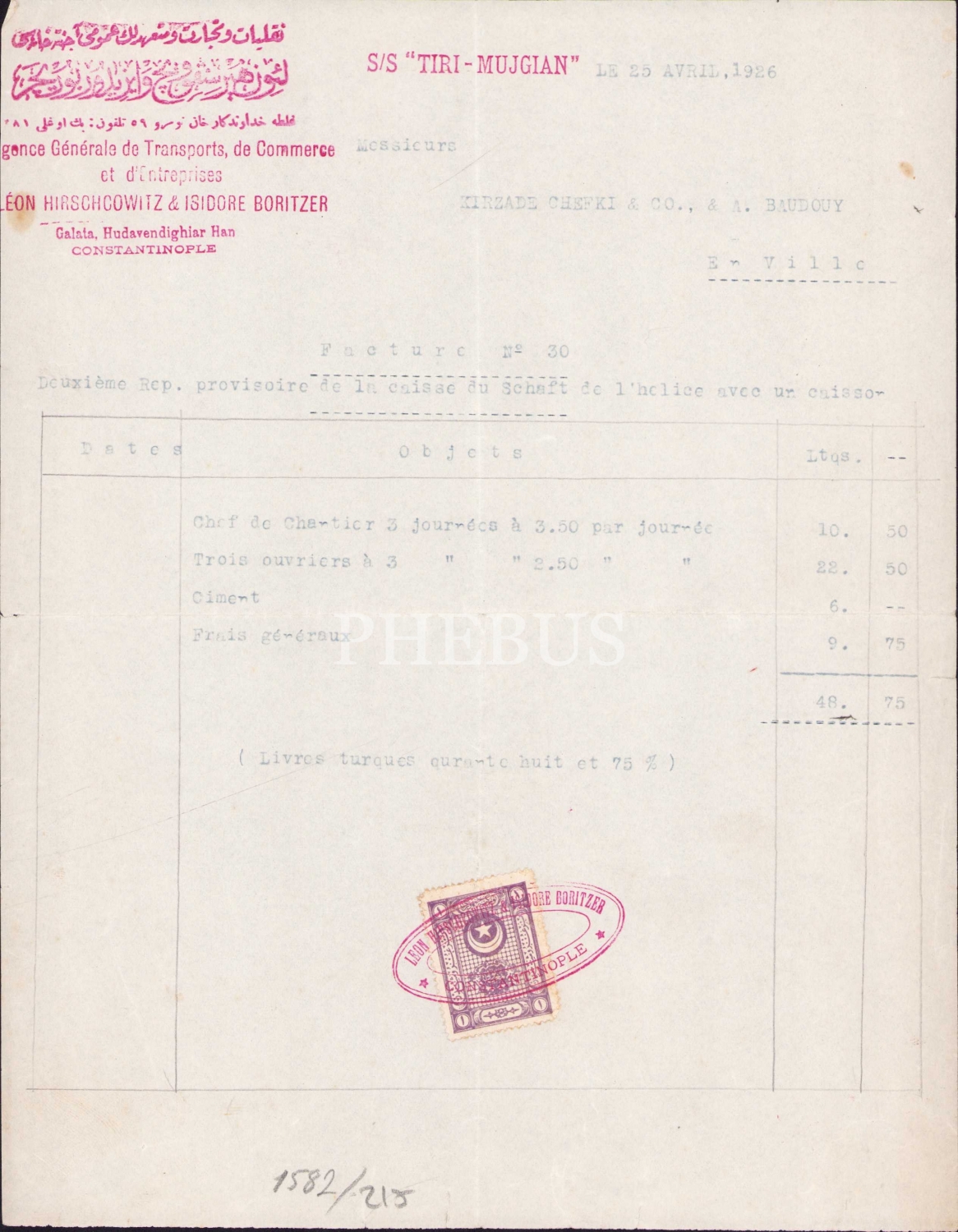Osmanlı dönemi iki dilde Leon Hırschcowitz & Isıdore Boritzer damgalı fatura, 26 Nisan 1926, Galata, 20x26 cm