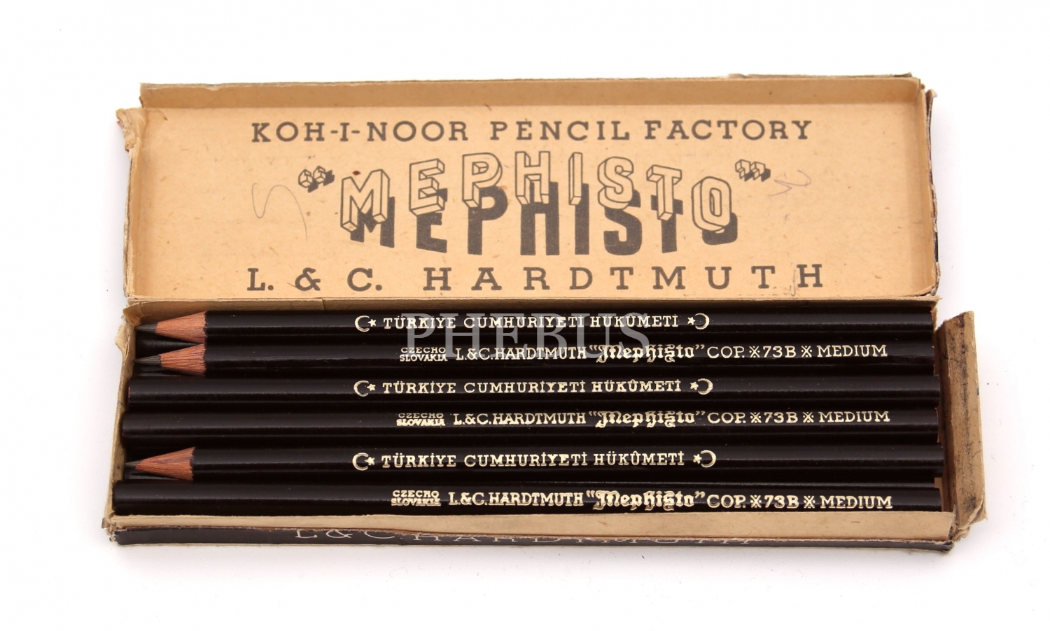 L & C. Hardmuth Çekoslavakya kutusunda, Türkiye Cumhuriyeti Hükümeti damgalı 12 adet kurşun kalem, 17x4x2 cm