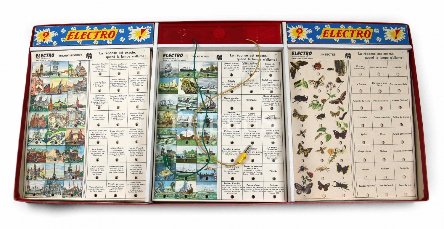 Elektro kutu oyuncak, soru kartları arasında Ayasofya, Türk bayrağı çizimleri mevcut ; kapakta Constantinople yazıyor, 60lar Fransız elektrikli bilgi oyunu 65x30 cm