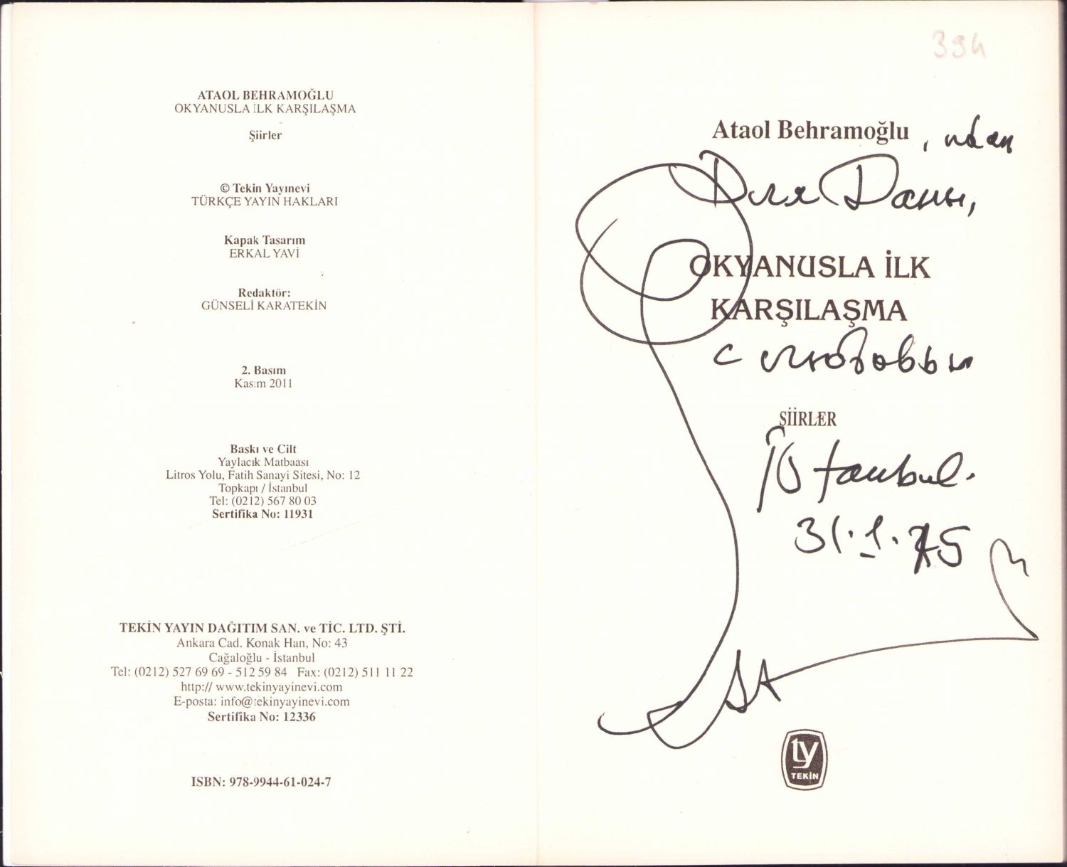 Okyanusla İlk Karşılaşma -Şiirler-, Ataol Behramoğlu'ndan imzalı ve ithaflı, 2011, 71 sayfa