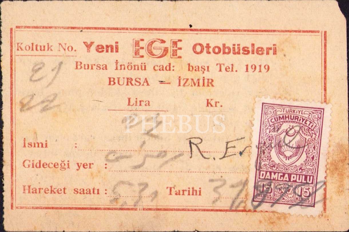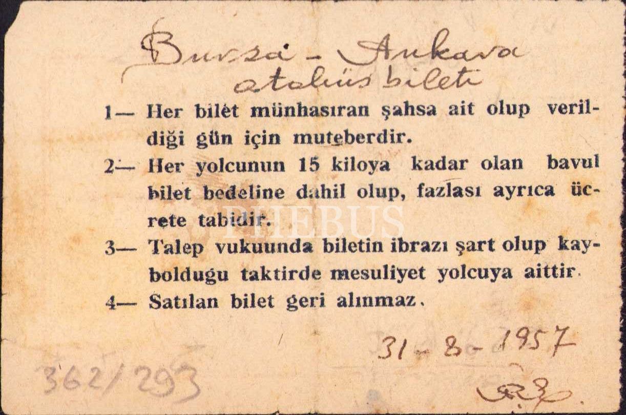 Yeni Ege Otobüsleri Bursa-İzmir yolcu otubüsü bileti, Bursa-Ankara seferi, 1957 tarihli, 10x7cm