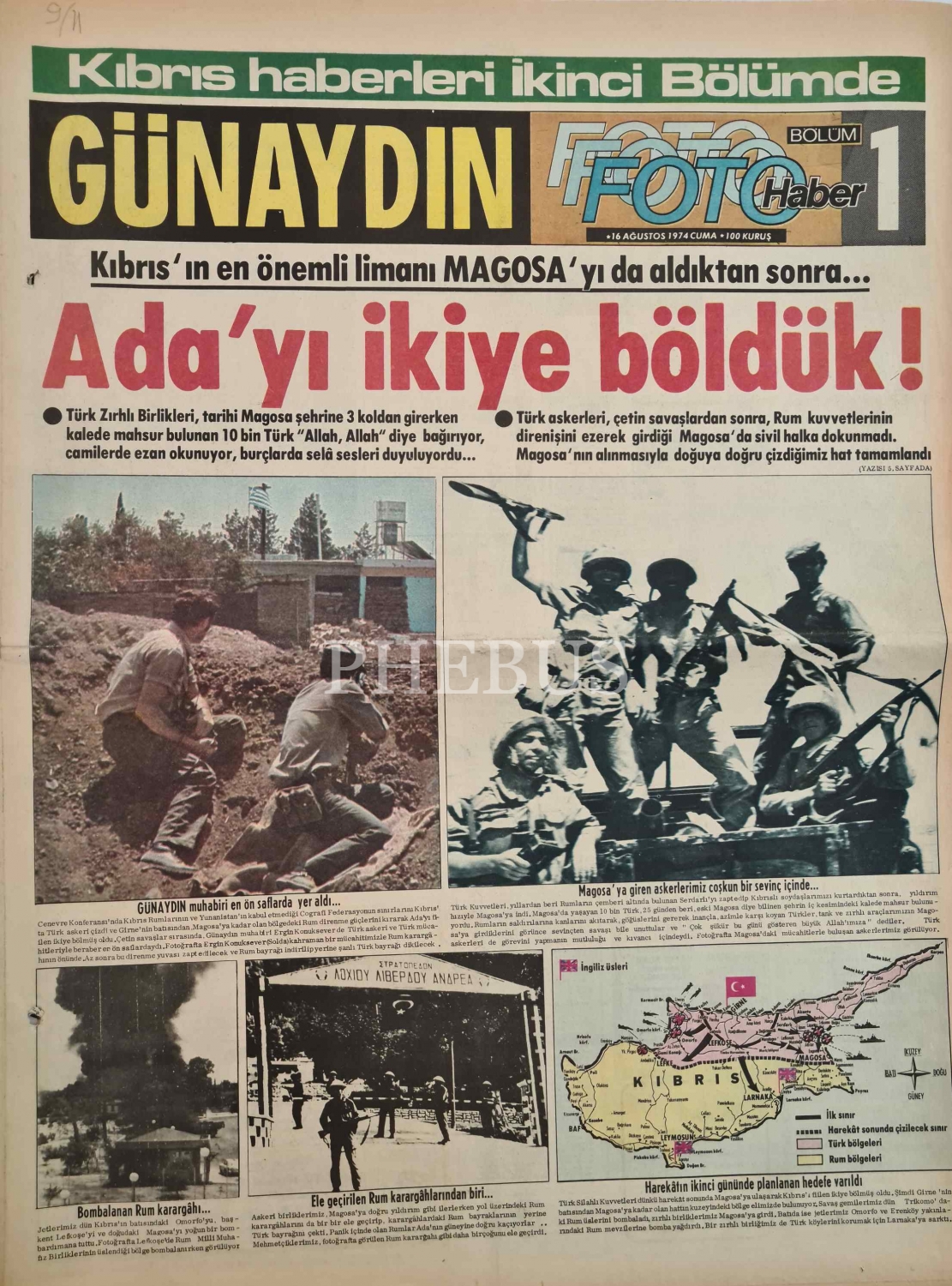 Günaydın gazetesi, 16 Ağustos 1974, 1. bölüm, "Kıbrıs'ın en önemli limanı Magosa'yı da aldıktan sonra Ada'yı ikiye böldük", 8 sayfa, 40x60 cm