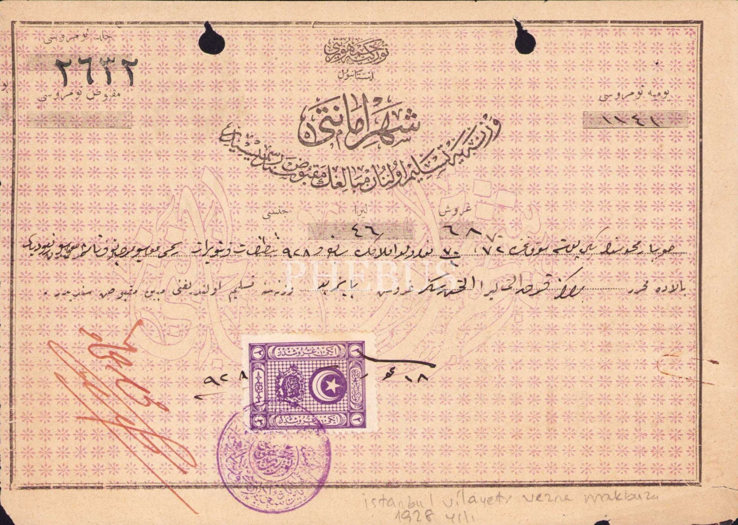 Türkiye Cumhuriyeti Şehremaneti İstanbul vilayeti Osmanlıca vezne makbuzu, 1928, 18x14 cm