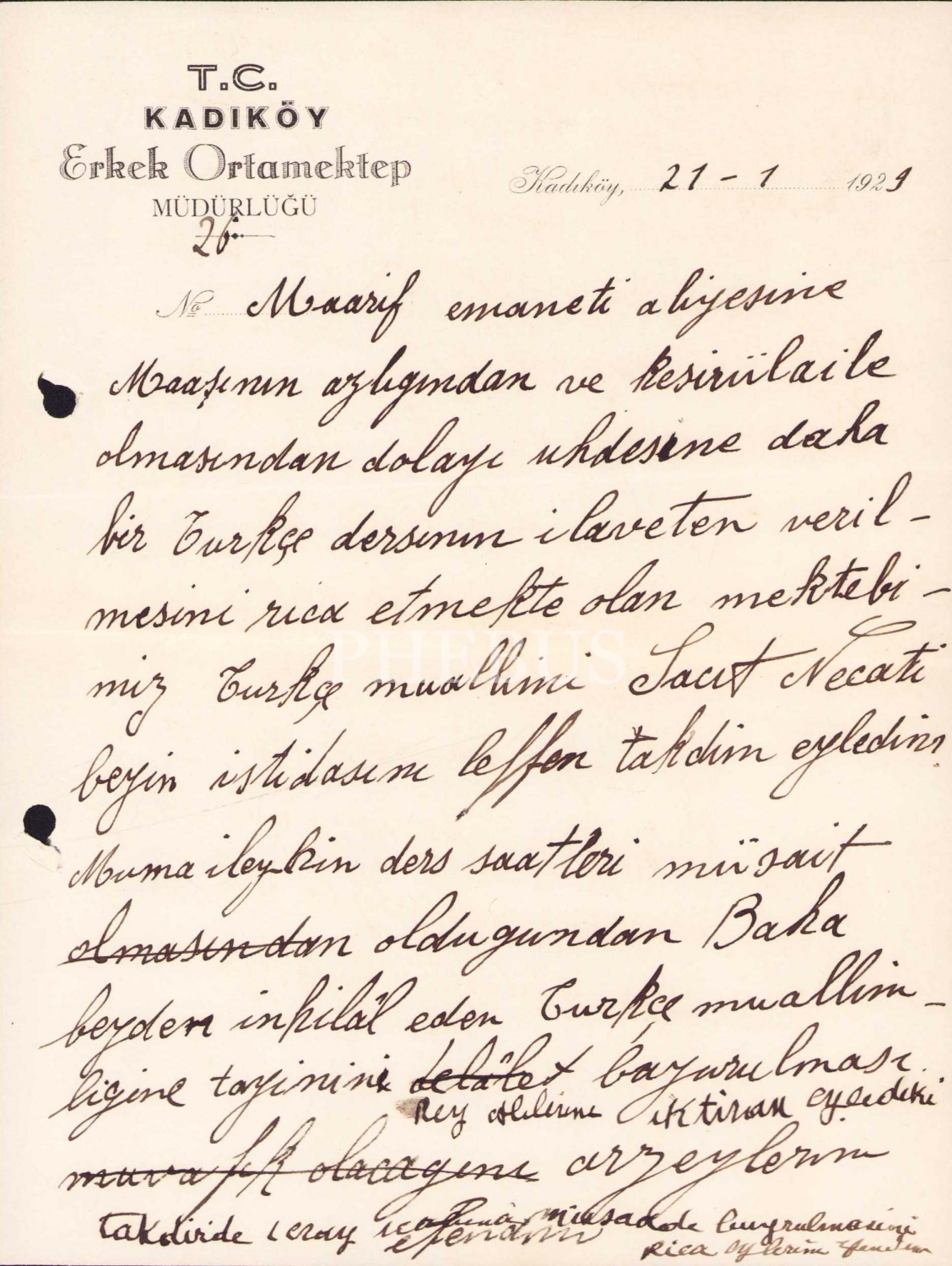 T.C. Kadıköy erkek ortamektep müdürlüğü antetli 1929 tarihli dilekçe, 16x21 cm