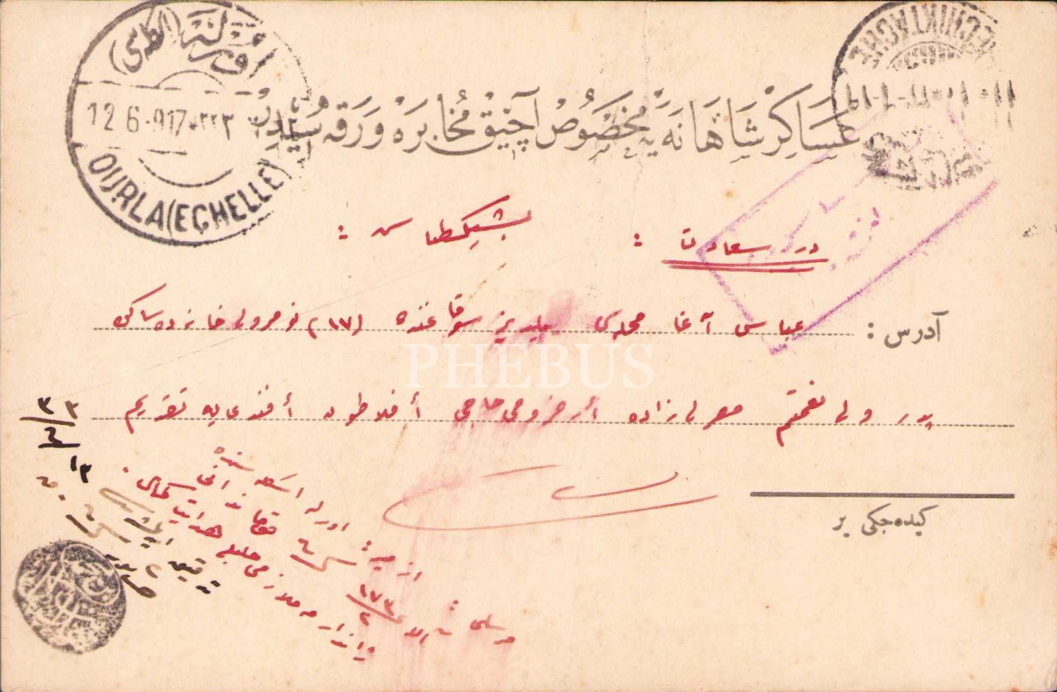 Askeri Şahaneye mahsus mektup kartı, Velinimetim pederim efendim yazılı İstanbul Beşiktaş'a gönderilmiş kart, Osmanlıca Urla damgalı, 10x15 cm