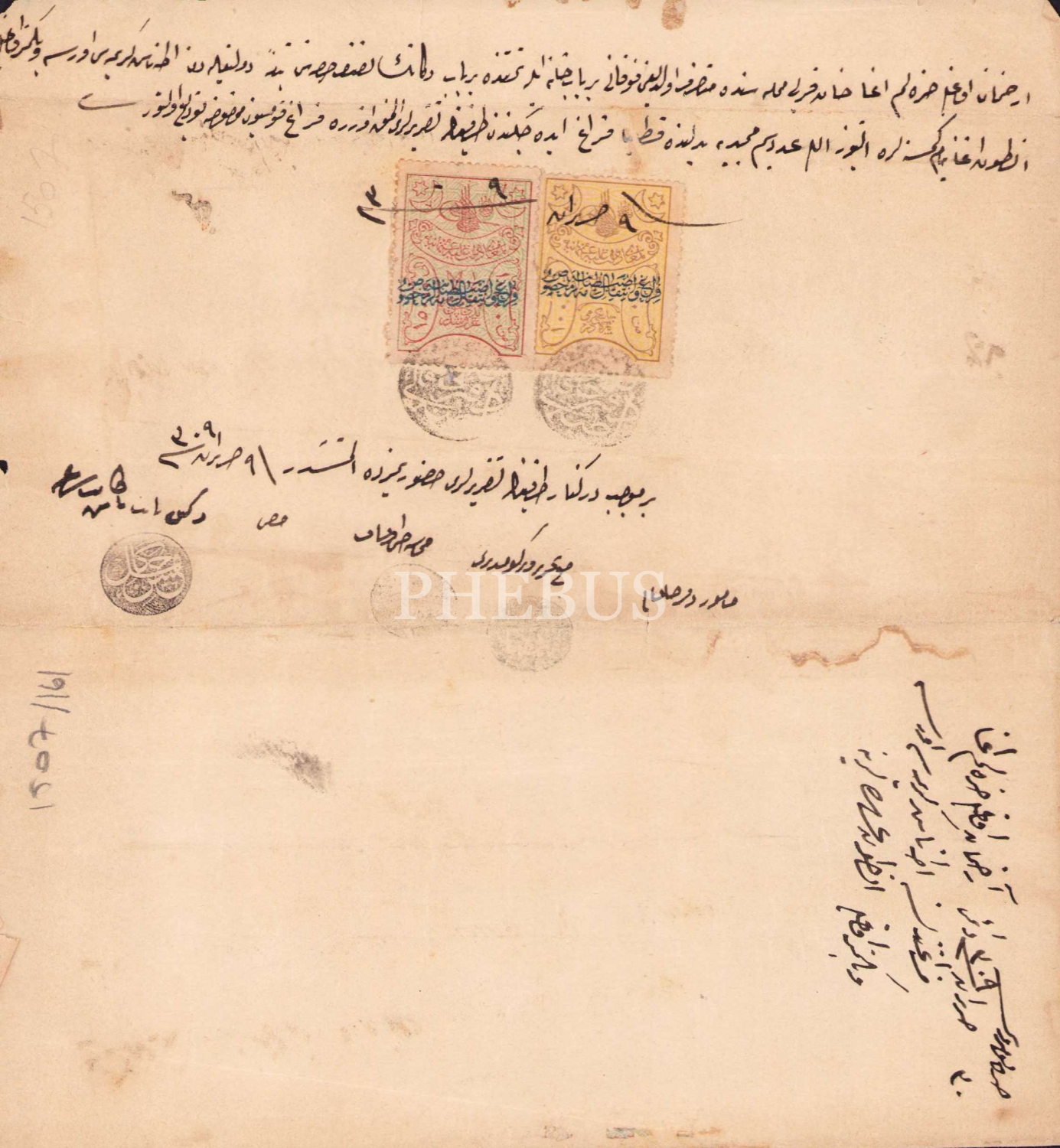 Bir bab dükkan ve mülkün Atanaz kerimesi Evrese hanıma devri hakkında Osmanlıca senet, katip damgalı, 1309, 18x20 cm