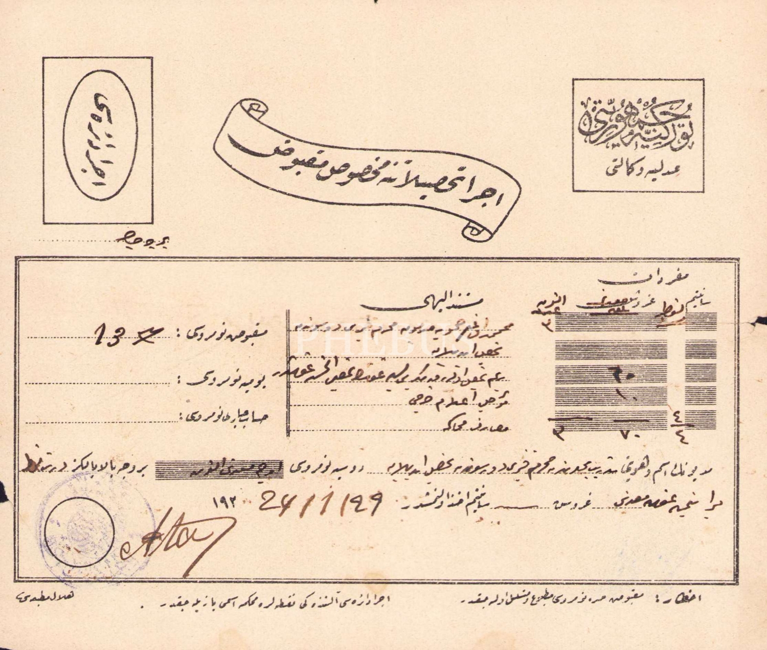 Osmanlıca icra tahsilatına mahsus makbuz,1929, 18x16 cm