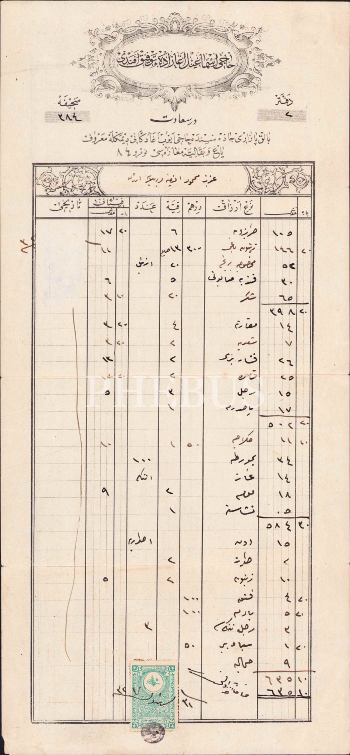 Osmanlıca Hacı İsmail Ağa Zade Tevfik Efendi antetli, 1327 tarihli fatura, 18x40 cm