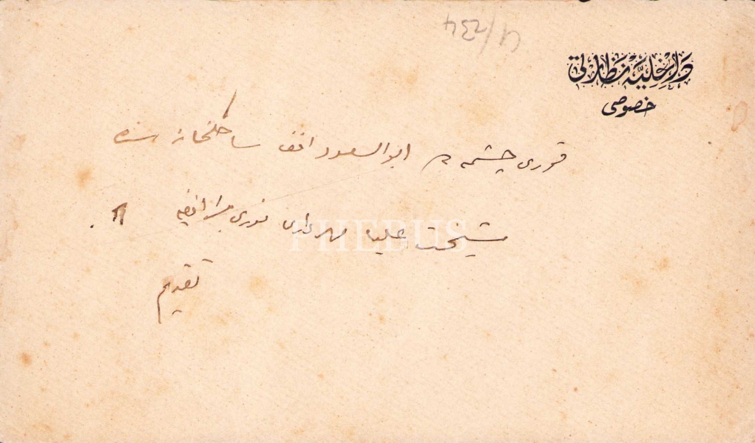 Osmanlıca Nezareti Hususi antetli zarf, Kuruçeşme Ebussuud Efendi Salhanesinde Mühürdar Nuri efendiye gönderilmiştir. 16x10 cm