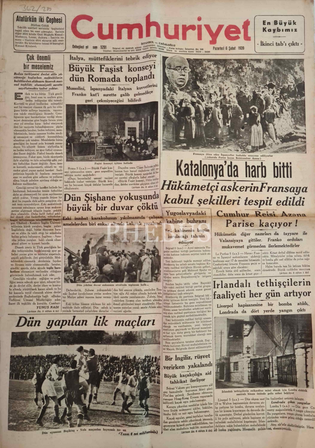 Cumhuriyet gazetesi, 8 Şubat 1939, "İtalya Müttefiklerini Tebrik Ediyor", "Katalonya'da Harb Bitti", 10 sayfa, 45x60 cm