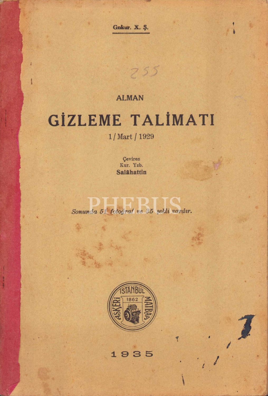 Alman Gizlenme Talimatı 1 Mart 1929, çev. Salahattin, İstanbul Askeri Matbaa, 1935, 51 fotoğraf, 35 şekil mevcut, 93 sayfa, 16x23 cm