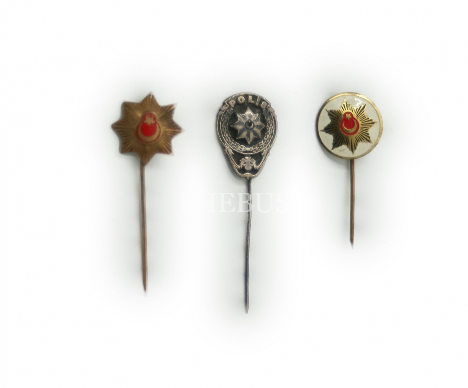 3 farklı rozet, Türk bayraklı, Polis yazılı rozet gümüştür, 3 cm