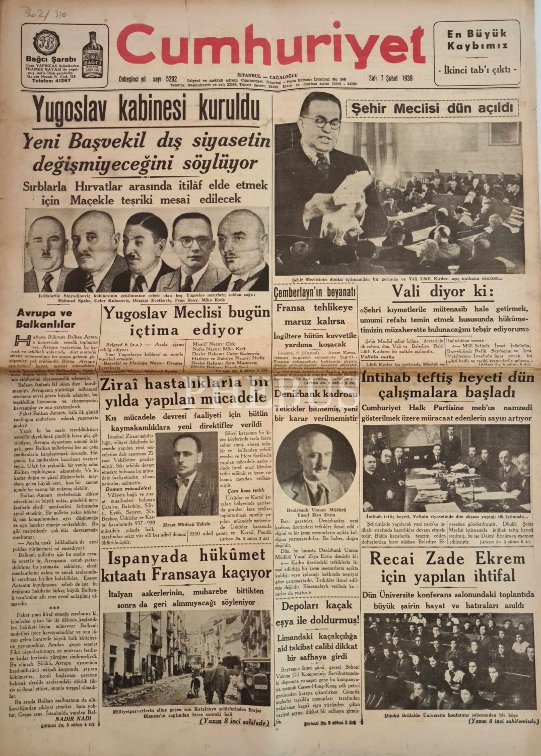 Cumhuriyet gazetesi, 7 Şubat 1939, "Yugoslavya Kabinesi Kuruldu", "Şehir Meclisi Dün Açıldı", 12 sayfa, 42x60 cm