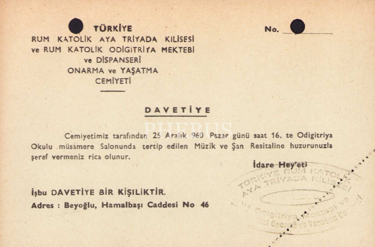 Türkiye Rum Katolik Aya Triada Kilisesi ve Rum Katolik Odigitria Mektebi ve Dispanseri Onarma ve Yaşatma Cemiyeti resital davetiyesi, 25 Aralık 1960, 13x8 cm