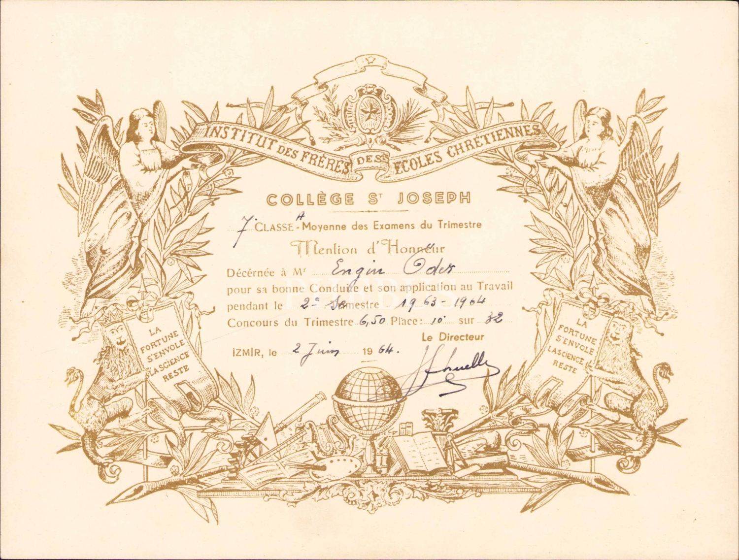 İzmir Fransız Lisesi St. Joseph aferin, 1964, 22x15 cm
