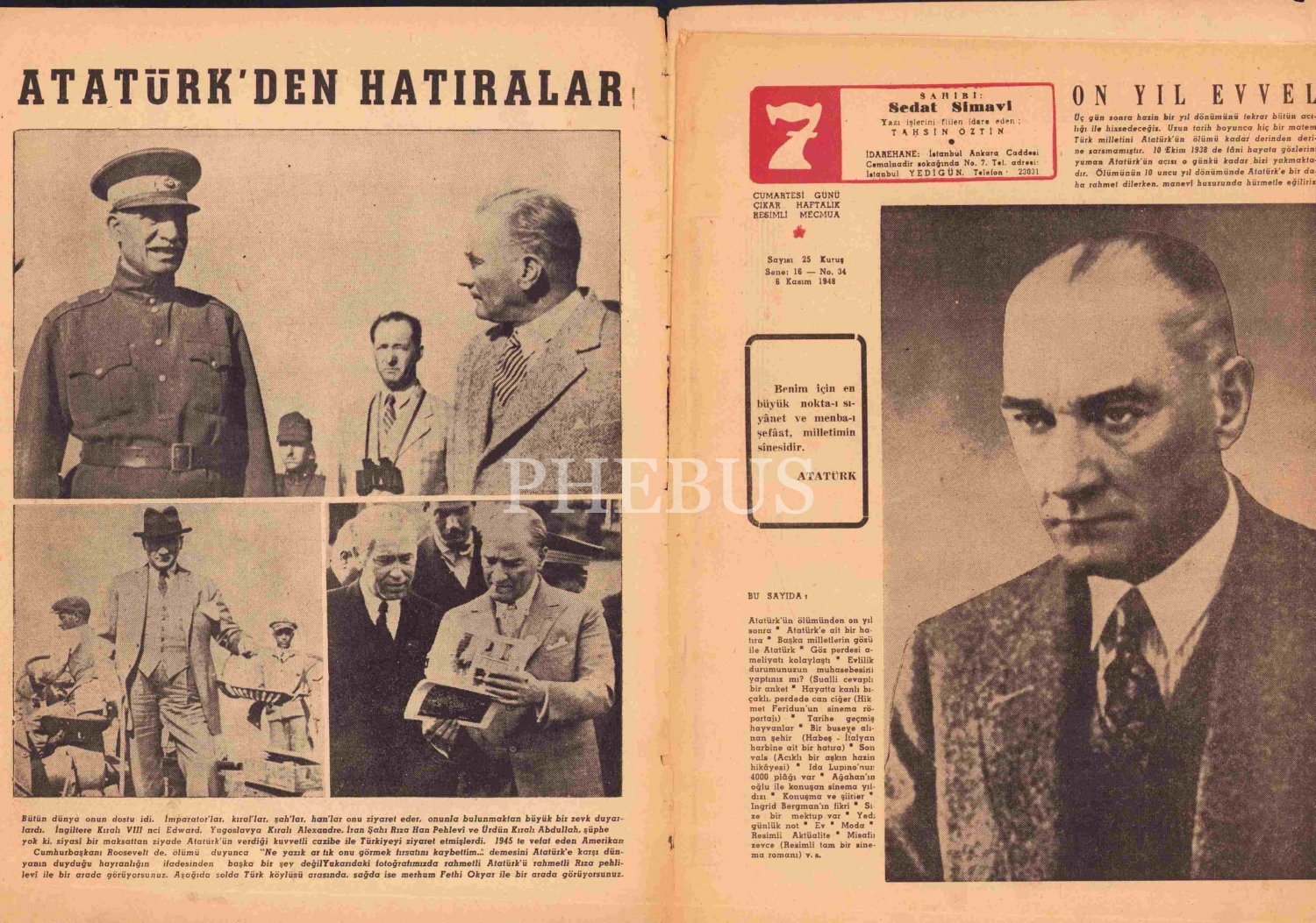Yedi Gün mecmuası, 6 Kasım 1948, sahibi Sedat Simavi, Atatürk özel sayı, sırtı haliyle, 28 sayfa, 21x28 cm