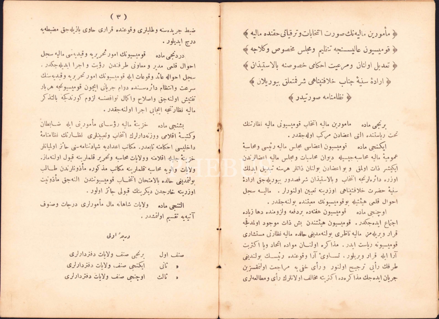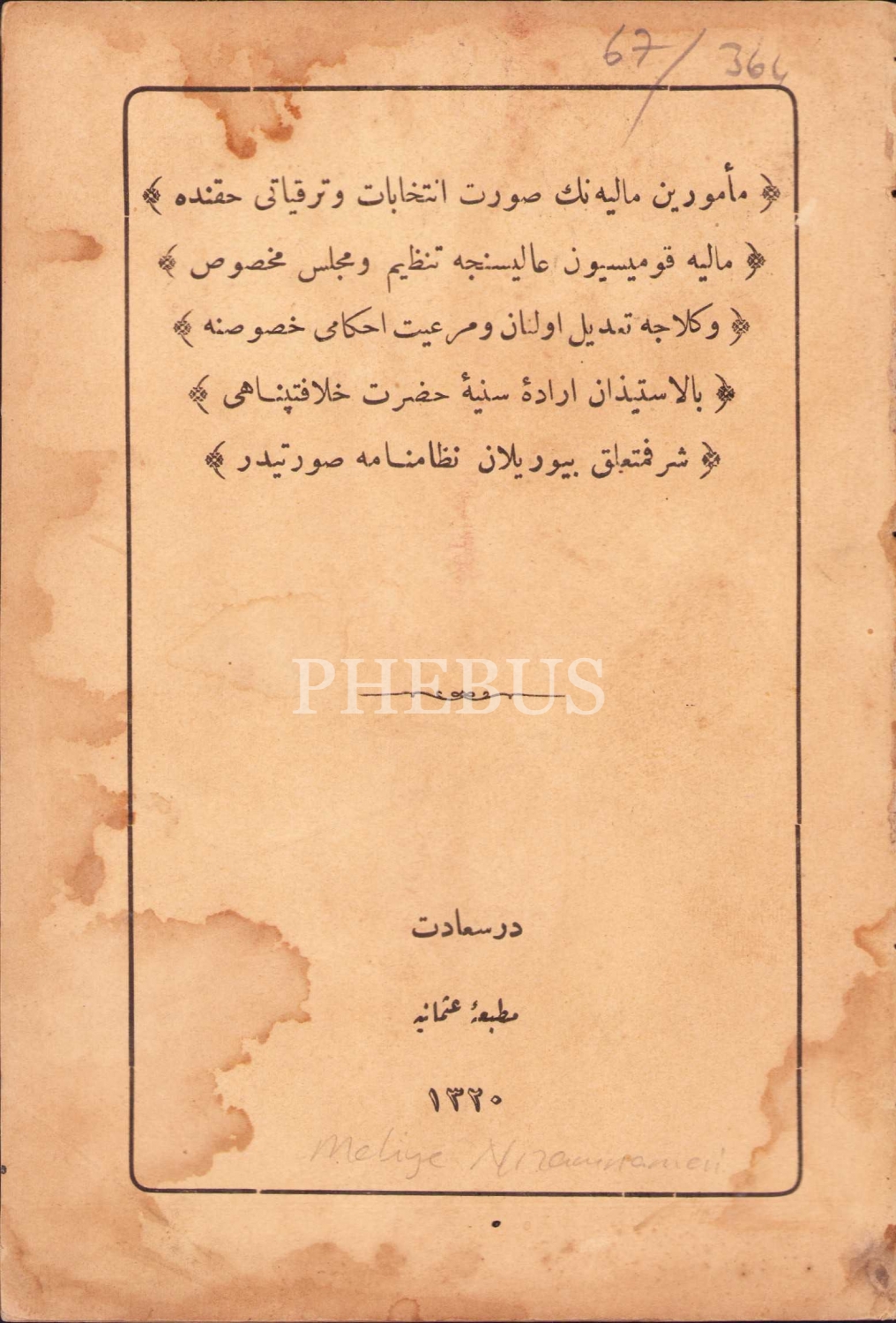 Memurin-i Maliyenin Suret-i İntihabat ve Terakkiyatı Hakkında Maliye Komisyon Aliyyesince Tanzim ve Meclise Mahsus Vükelaca Ta'dil OKunan Ve Meri'ye Ahkamı Hususunda Hilafetpenahi buyrulan Nizamname sureti,