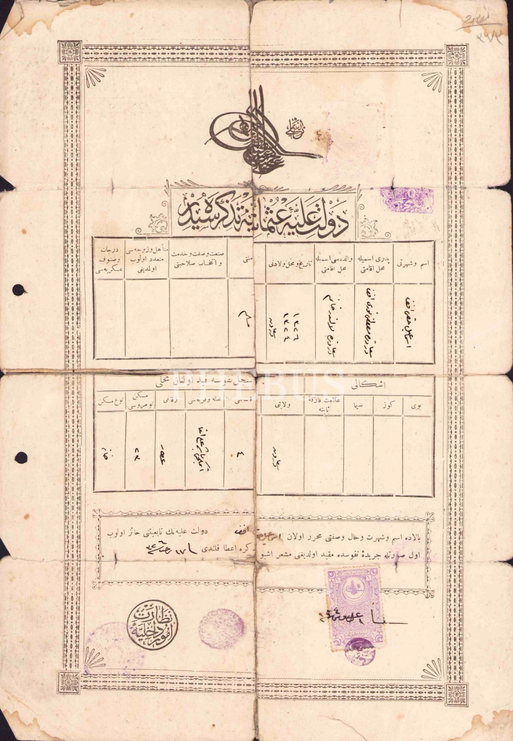 Osmanlıca nüfus tezkiresi, Dersaadet, 1326, haliyle, 23x32 cm