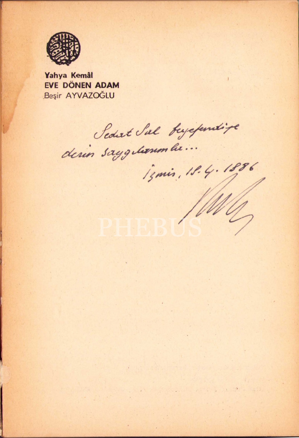 İthaf, "Sedat Sal beyefendiye derin saygılarımla İzmi, 19.4.1986" şeklindedir.