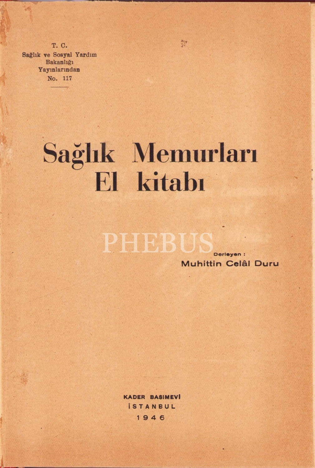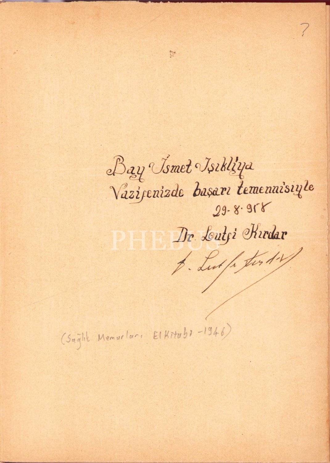 TC Sağlık ve Sosyal Yardım Bakanlığı Yayınlarından "Sağlık Memurları El Kitabı", Muhittin Celal Duru, Dr. Lütfi Kırdar'dan İsmet Işıklıya ithaflı ve imzalı, Kader Basımevi, İstanbul, 1946, 430 sayfa, 16x23 cm