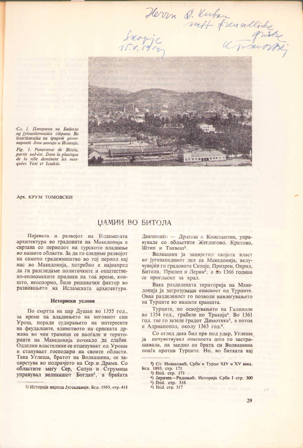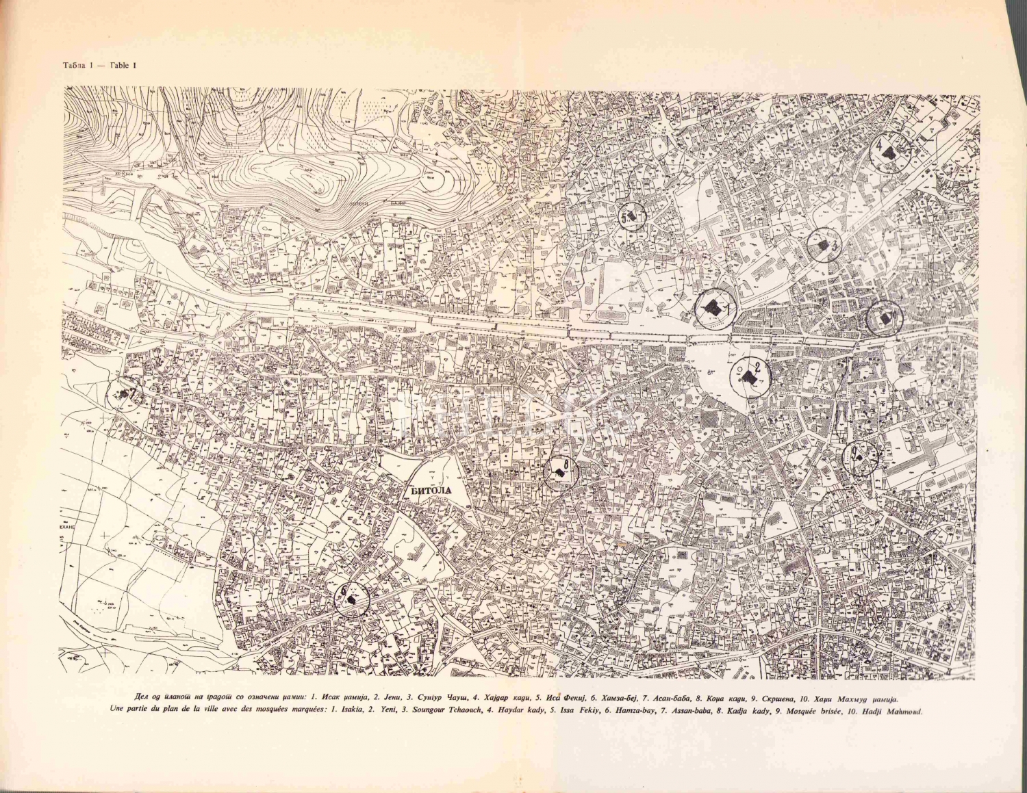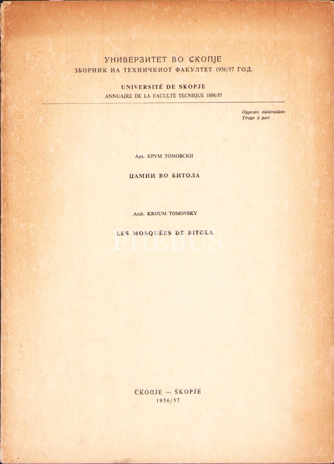 Rusça kitap, Üsküp Üniversitesi Teknik Fakültesi tarafından yayınlanan Kroum Tomovky'dan ithaflı ve imzalı Bitola'daki [Manastır] Camiler ile alakalı çalışma, Üsküp 1956/57, 32 sayfa, 20x28 cm