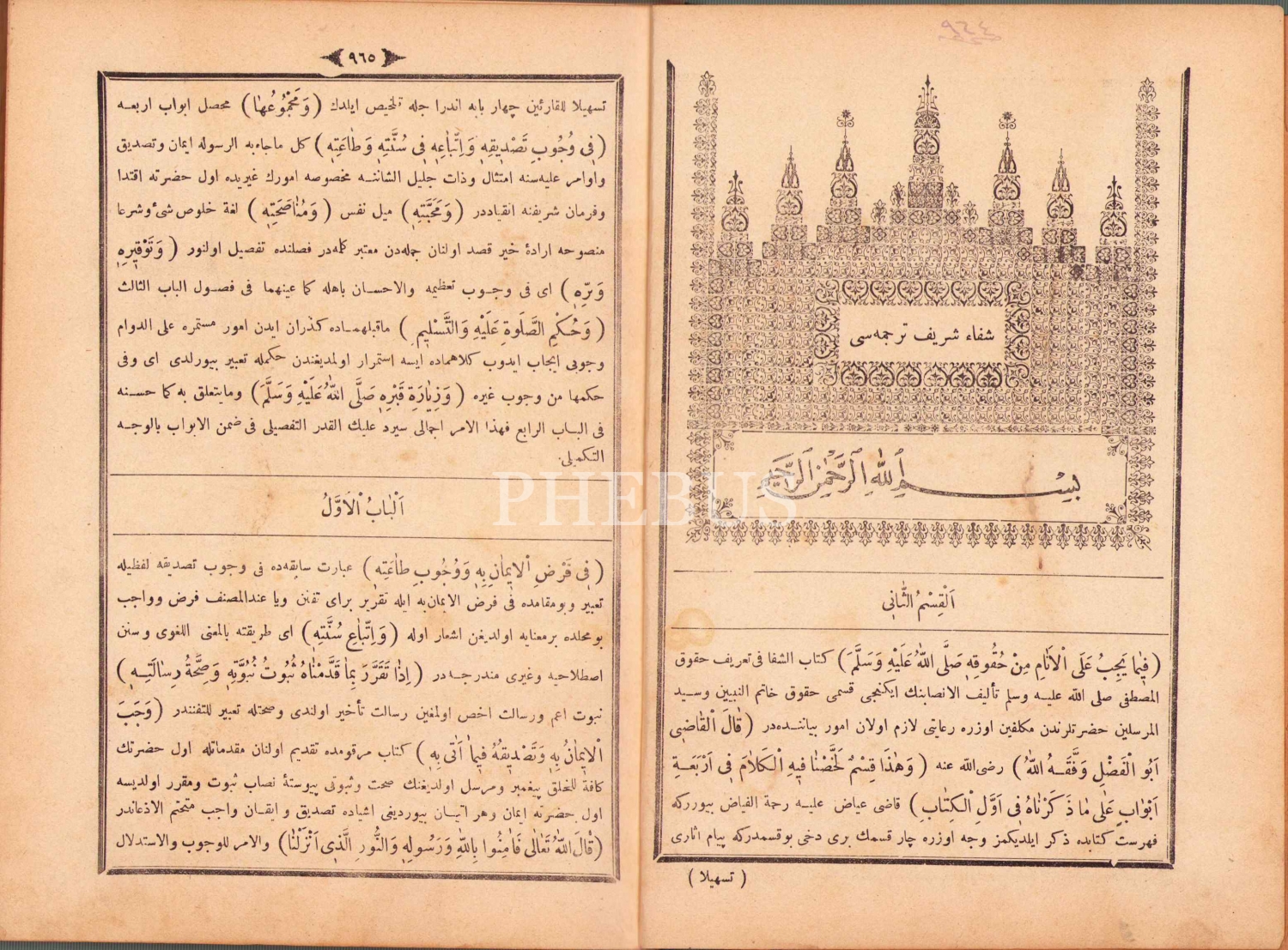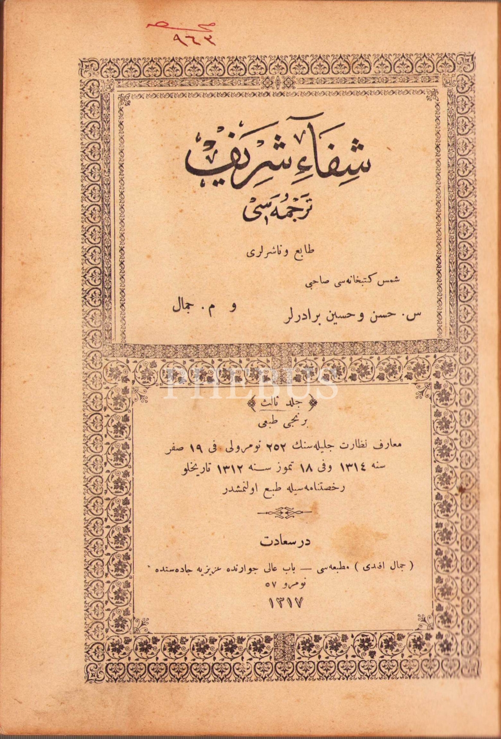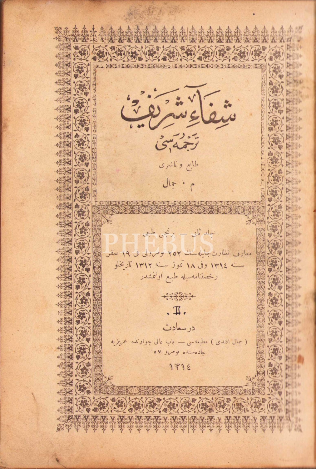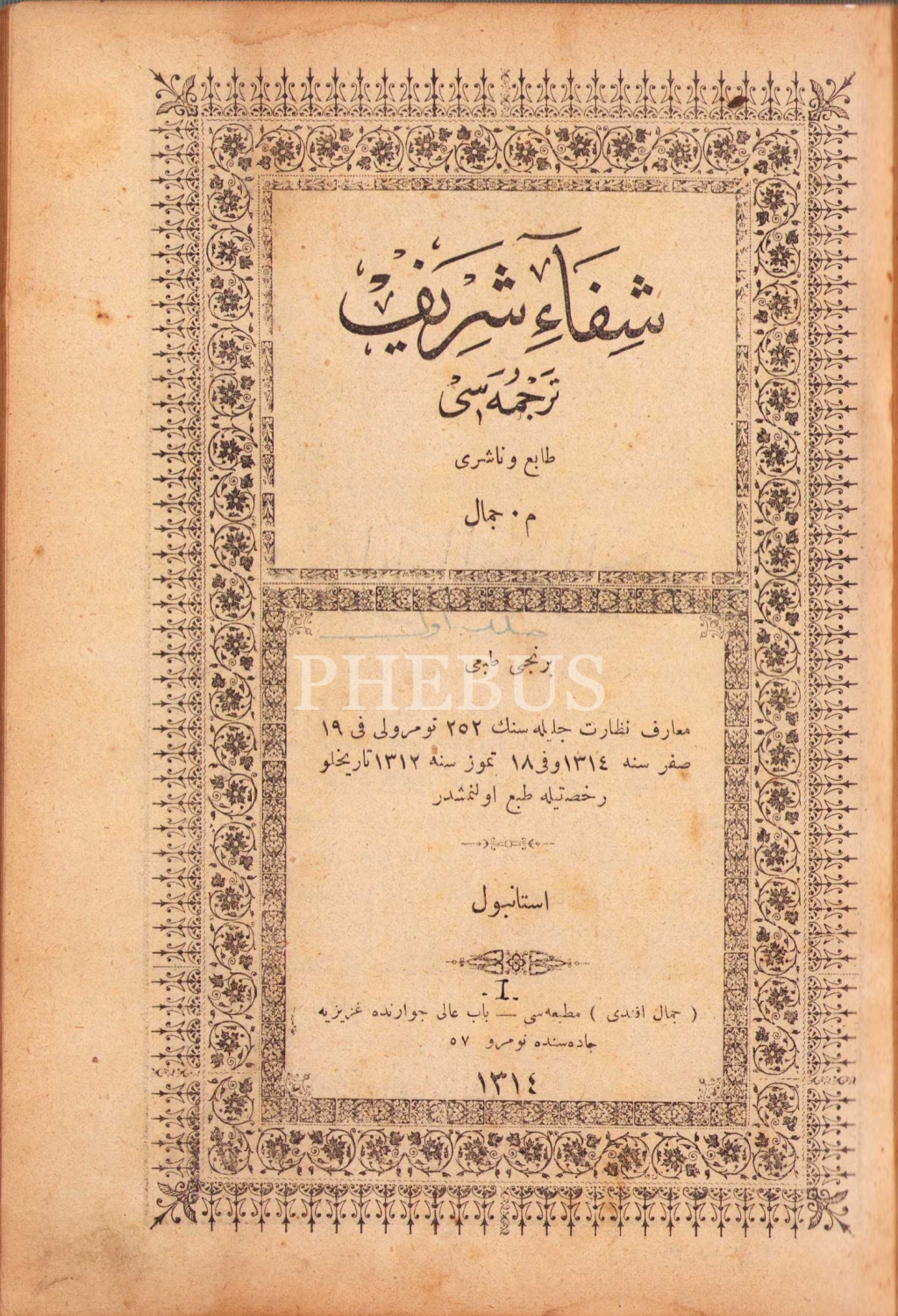 Osmanlıca Şifa-i Şerif Tercümesi [3 cilt bir arada], Kadı Ebülfazl İyaz b. Musa, çev. İbrahim Hanif, İlk Baskı, Cemal Efendi Matbaası, [1314 - 1317], miklepli, 1426 sayfa, 16x23 cm, ÖZEGE; 18948